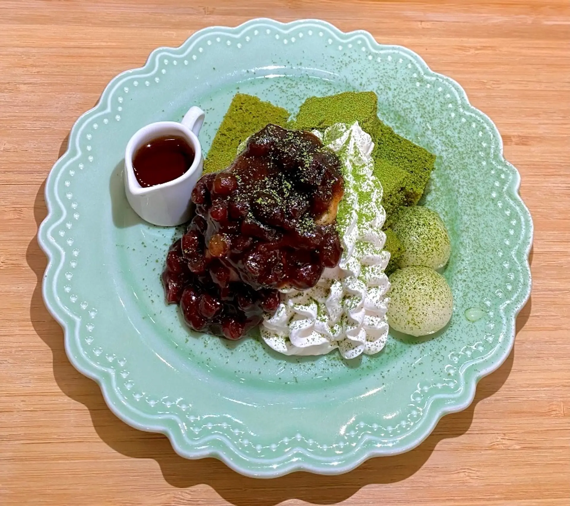 ふわふわシの抹茶フォン生地にとろとろあずき、モチモチ白玉✨