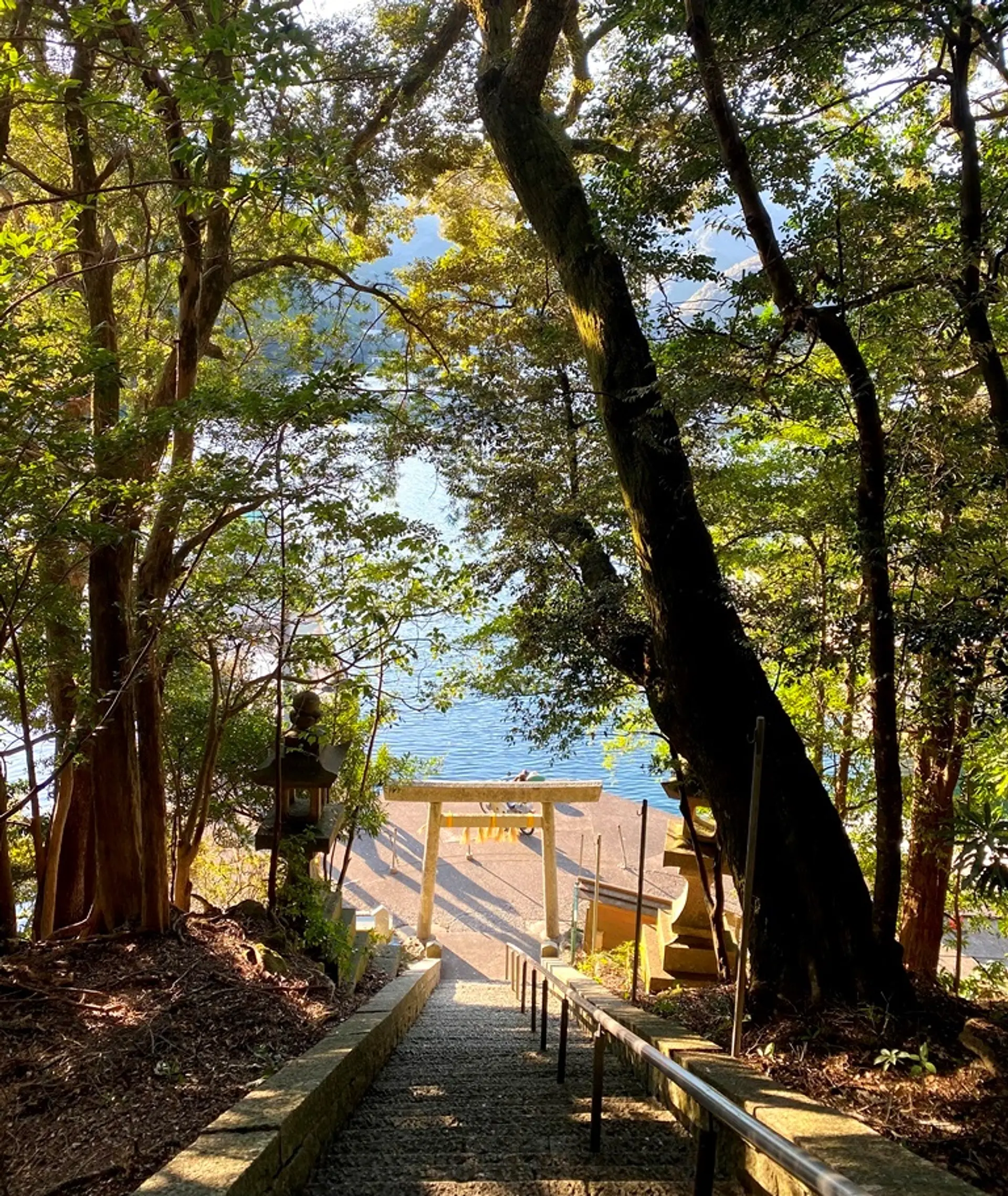 海へと降りていく石階段から見える鳥居は神々しいです。