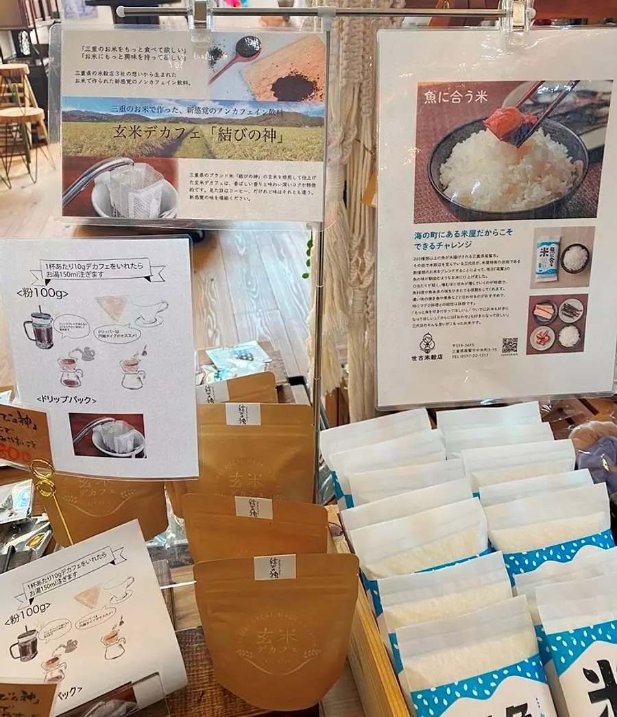 写真左は三重県のブランド米「結びの神」を焙煎した”玄米デカフェ”。