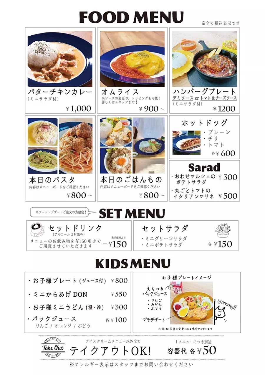 他にはパスタ、オムライス、ハンバーグ、キッズメニュー、デザート等があります。