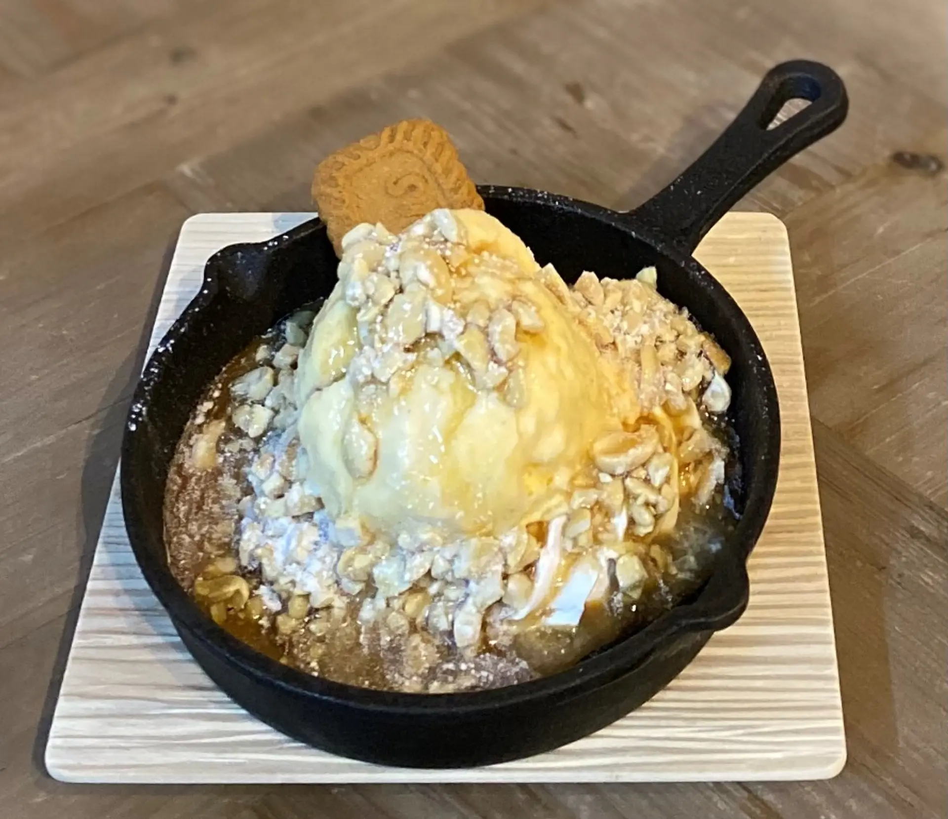 自家製アイスクリームと生クリームにローストしたカシューナッツと漬け込んだハニーナッツをのせキャラメルソースをかけています。