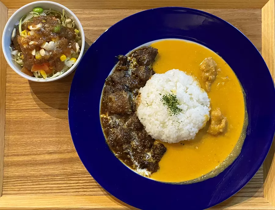 バターチキンカレーと期間限定牛すじカレーのあいがけです。