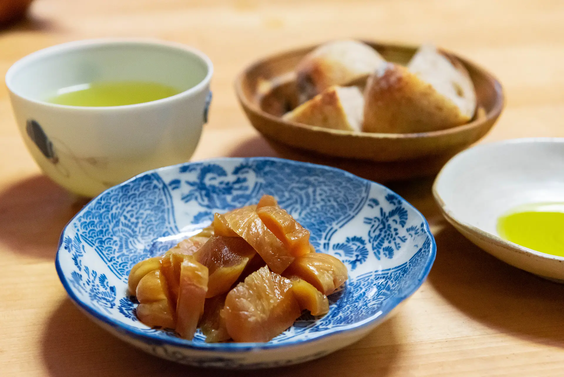 「これも無農薬のお茶なのよ」といれていただいた緑茶と、前の畑で採れたハヤトウリを使った手作りの奈良漬け、ライ麦パンを一緒にいただきます。緑茶はとても華やかな香りで優しい味、奈良漬けとライ麦パンの意外過ぎる相性の良さに驚きながら、食べる手が止まりません。