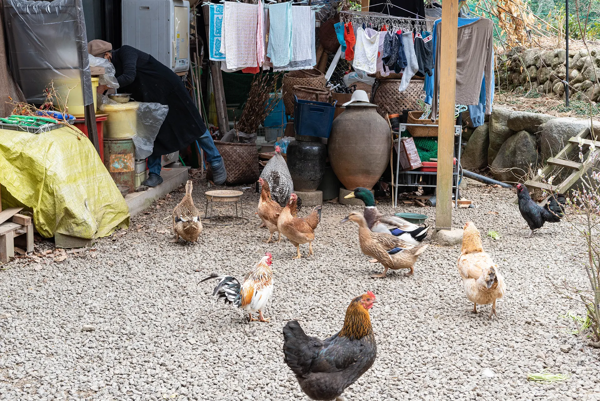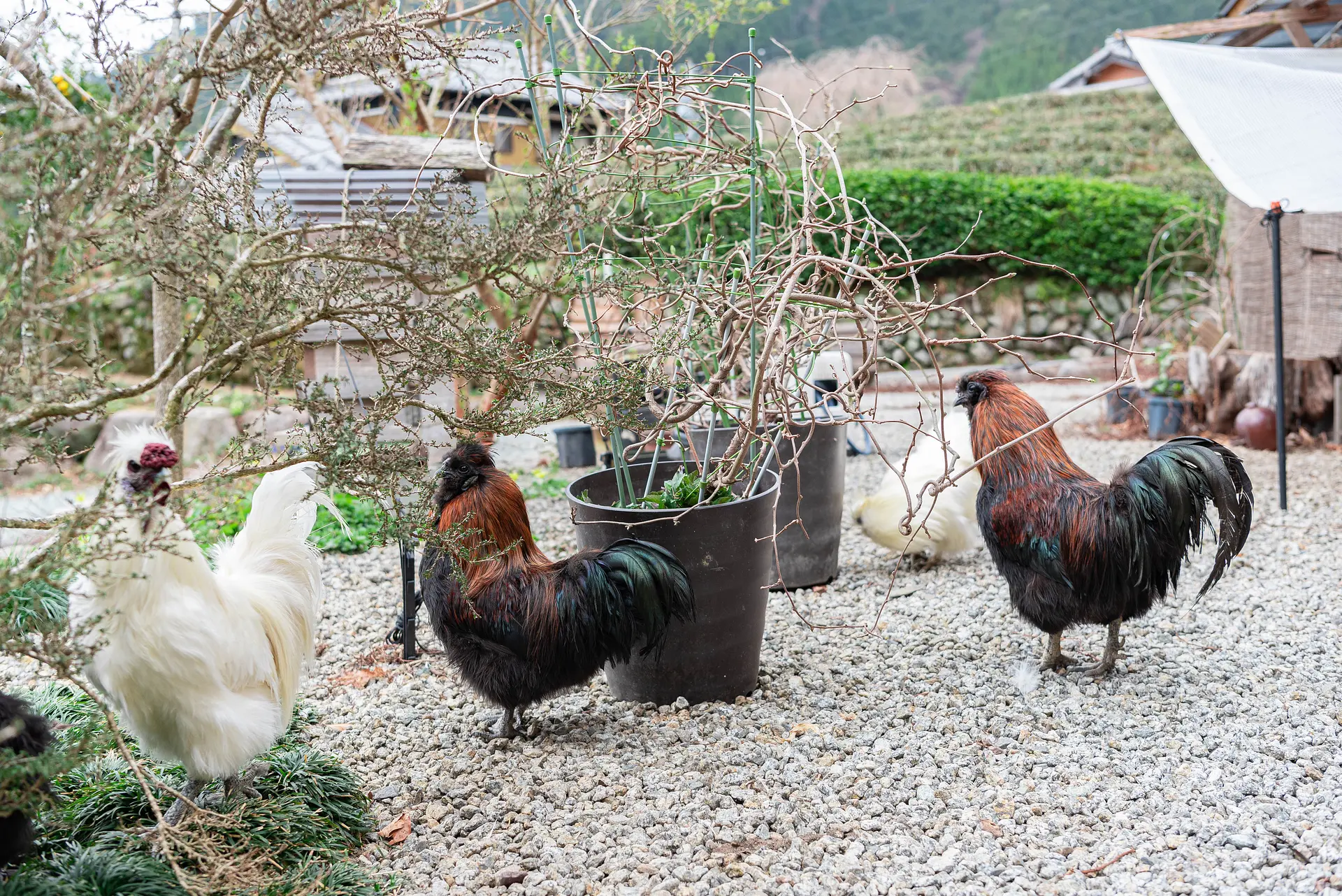 そんな人々の目を楽しませているのが、庭先で飼われているニワトリたち。柵で囲ったりしていないのに、みんなが離れ離れになることもなく、時々鳴き声を上げながら庭先を歩き回り、雑草などをついばんでいます。のどか。