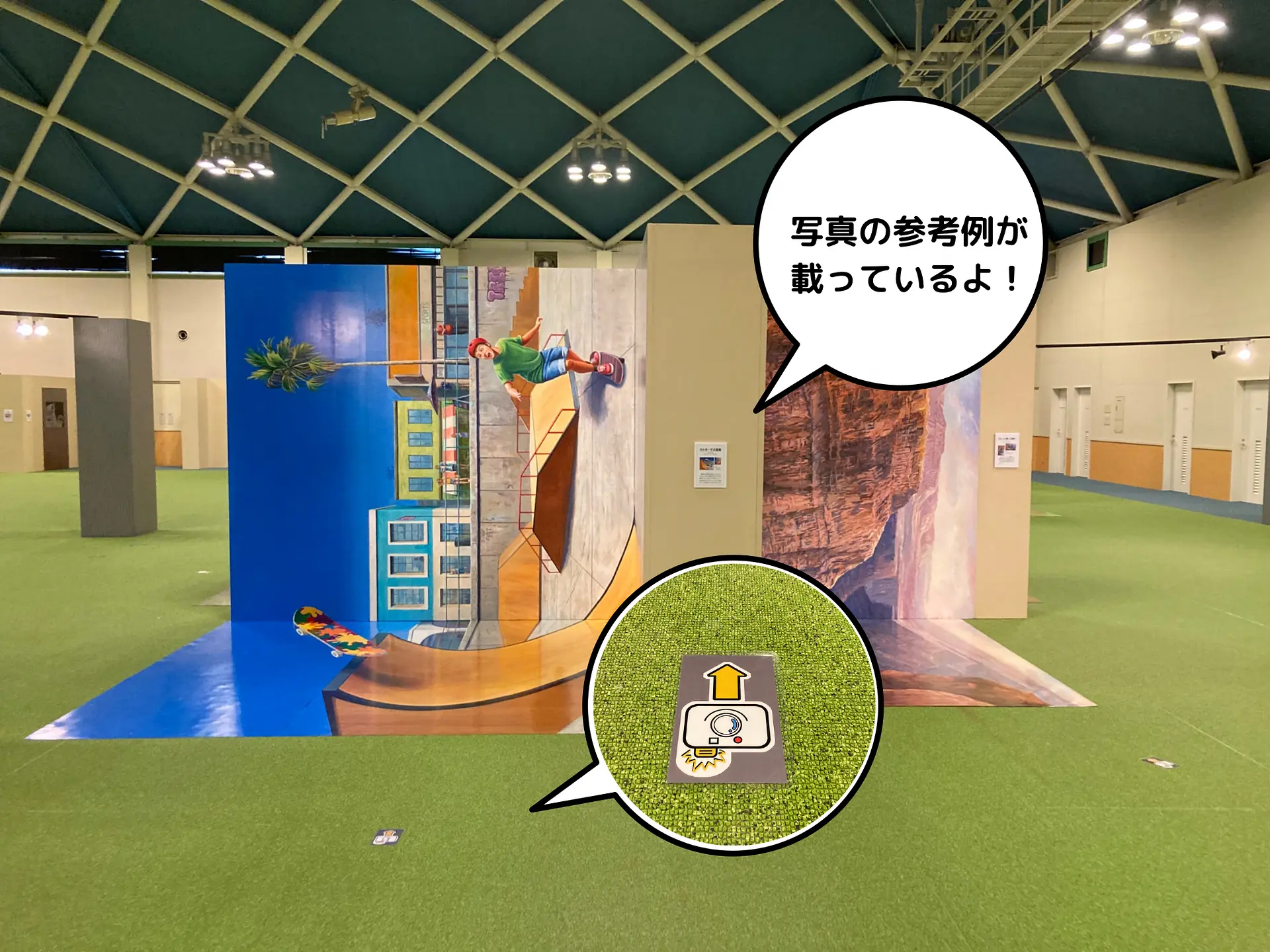 作品を前にすると、「どうやって撮るんだろう?」と思うかもしれませんが、作品横に参考例が載っているので、それを真似してみるのもいいかもしれません。また、床に描かれている「カメラマーク」の位置から写真を撮ると、より立体的な写真を撮ることができます。