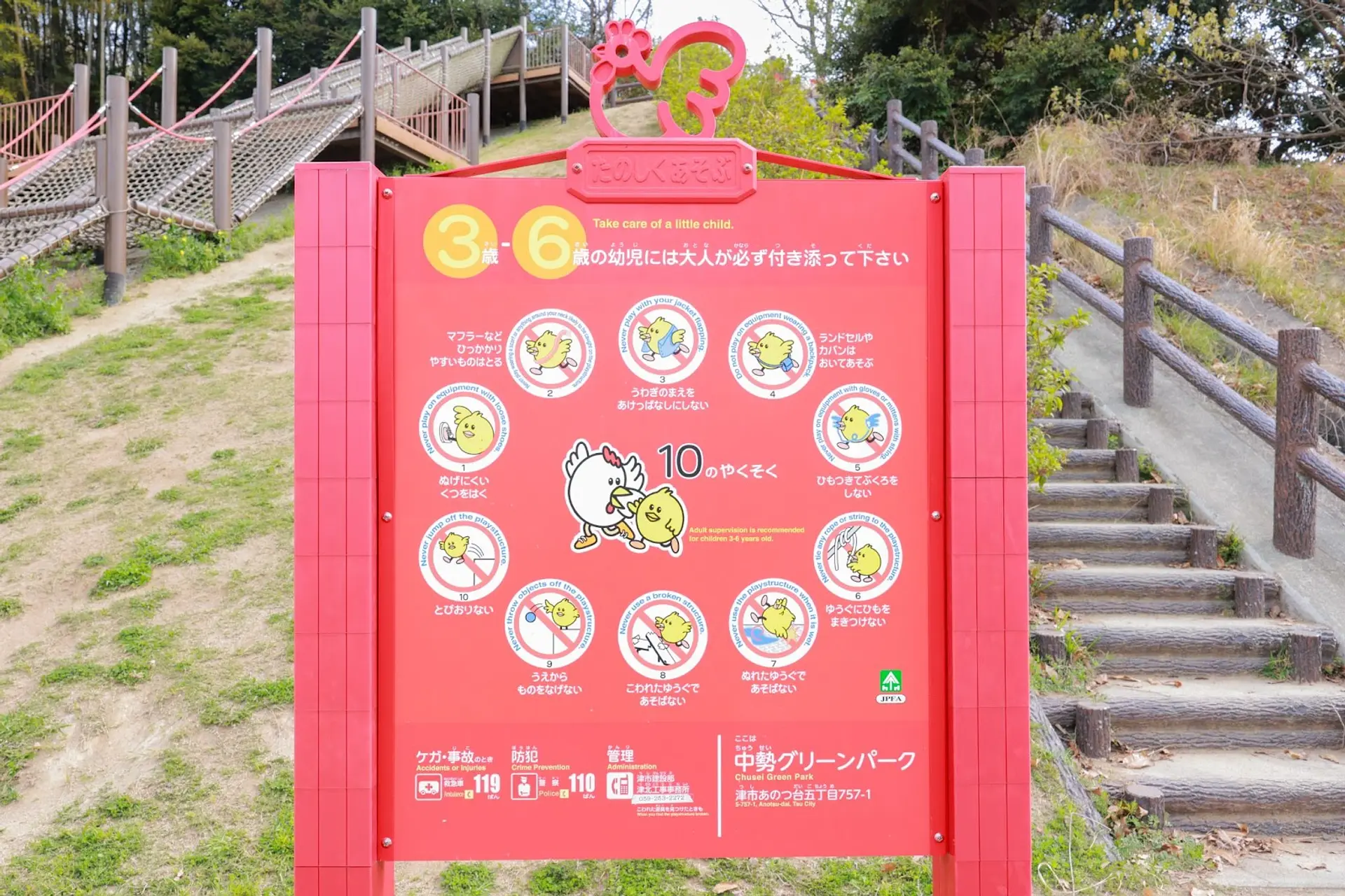 この遊具の看板には「ぬげにくいくつをはく」「ひもつきてぶくろをしない」などの注意事項も記載されており、目を通しておくと怪我のリスクを軽減できますよ。