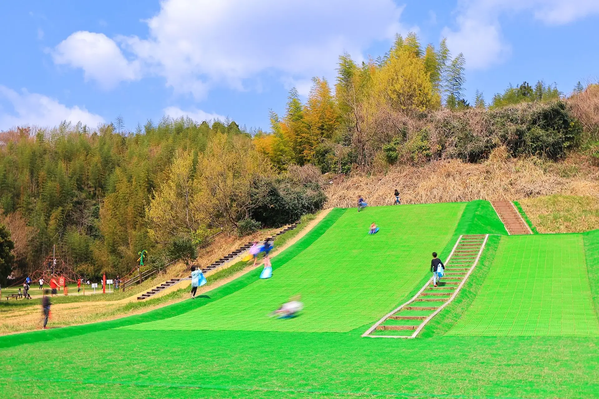 ここには、人工芝が張られた傾斜の坂があり、ソリで滑って楽しめますよ。