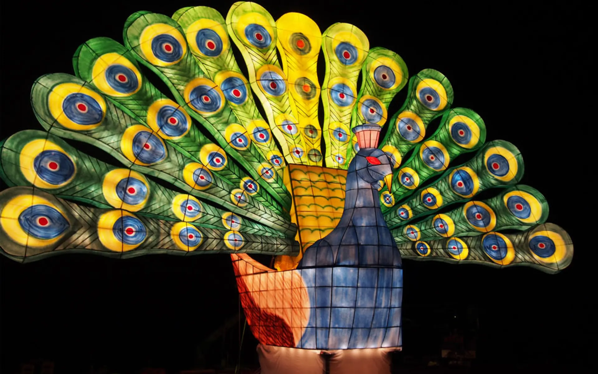 (上記写真は2017年の大燈籠「孔雀」広げた羽が見事ですね!)