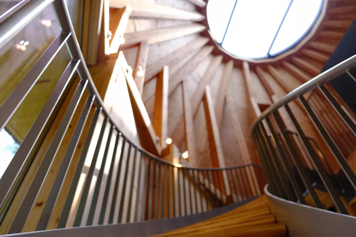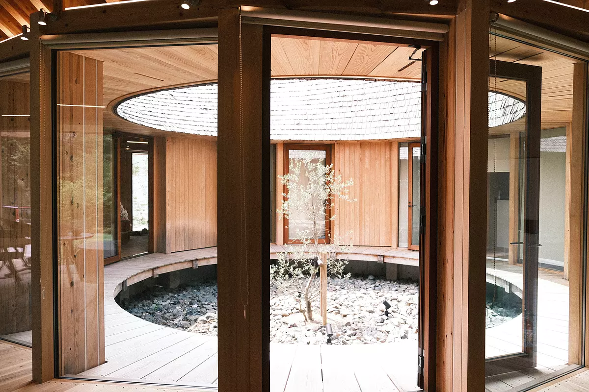 日本とデンマークの伝統的な建物の伝統を融合した優しくて謙虚な形状は見る角度によって様々な表情を見せてくれ、 円形に形どられた屋根に切り取られた空は1日として同じことはなく、常に驚きを提供してくれます。