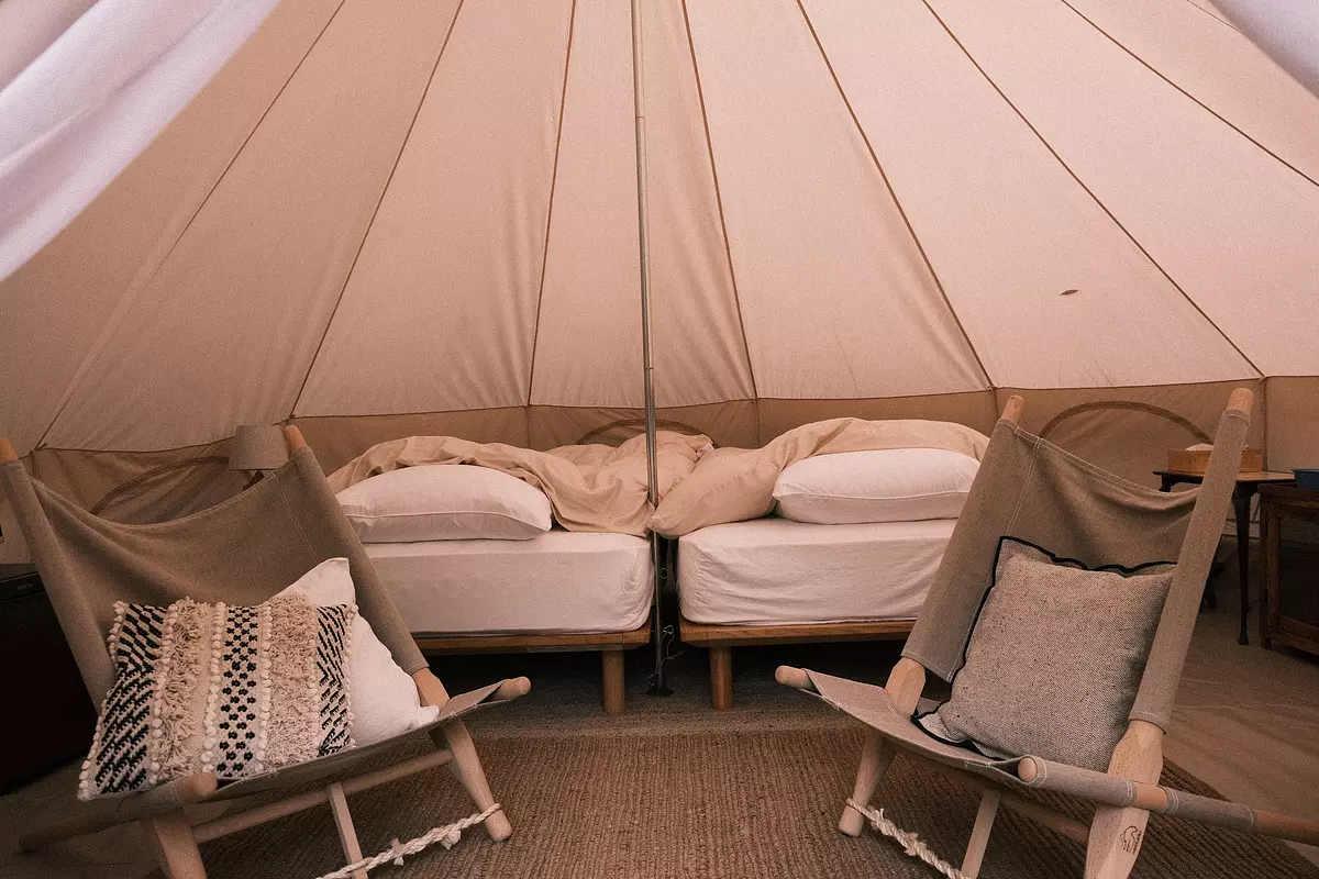 太陽光が降り注ぎ、大自然と一体化した心地良い寛ぎ。ロケーションと調和した、テント毎に異なるコンセプチュアルな設えは、非日常を愉しむ気分を高めてくれます。
