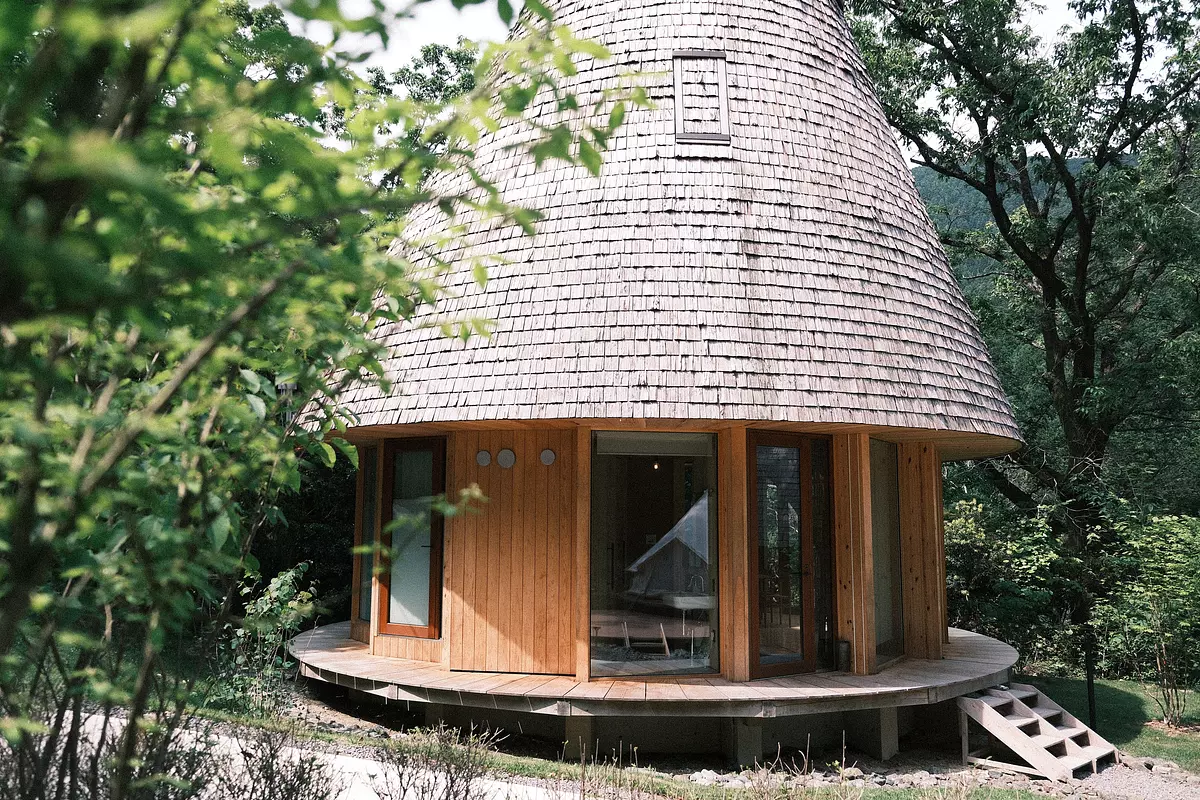 グランピングエリアであるCABINは、センターハウスの特徴的な屋根と円形の形を受け継いでおり、まるで一つの家族のような形が特徴。