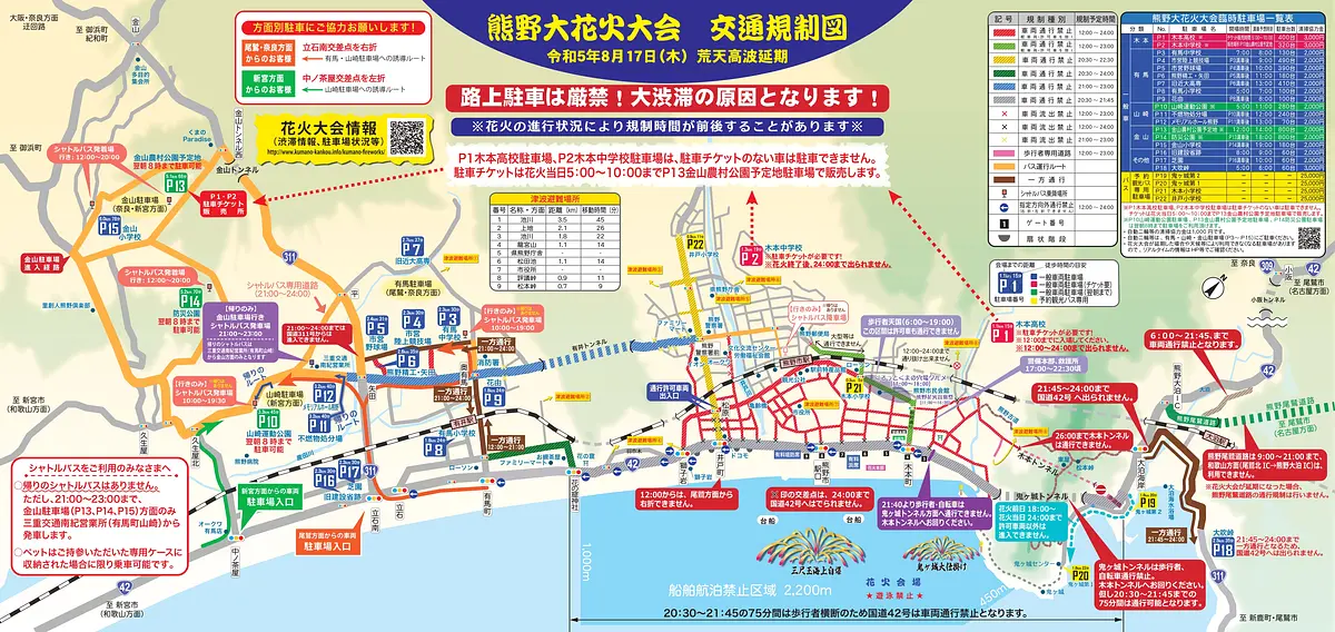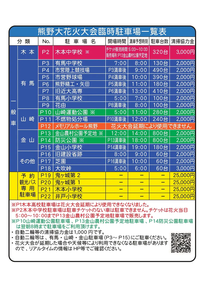※臨時駐車場の駐車率などリアルタイムの情報は熊野大花火大会更新アカウントから確認できます。