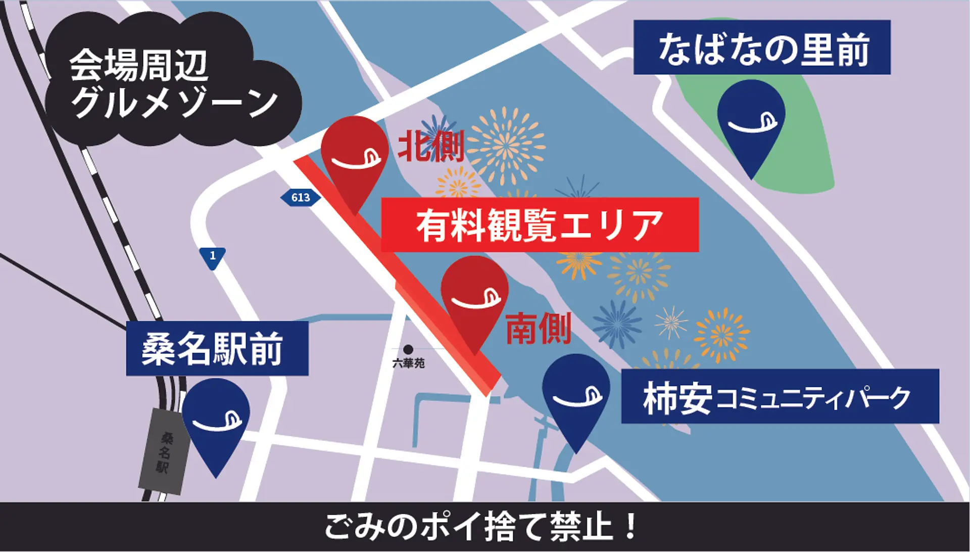 ※なばなの里から有料観覧席までは3km以上ありますので、お時間に余裕をもってお越しください。