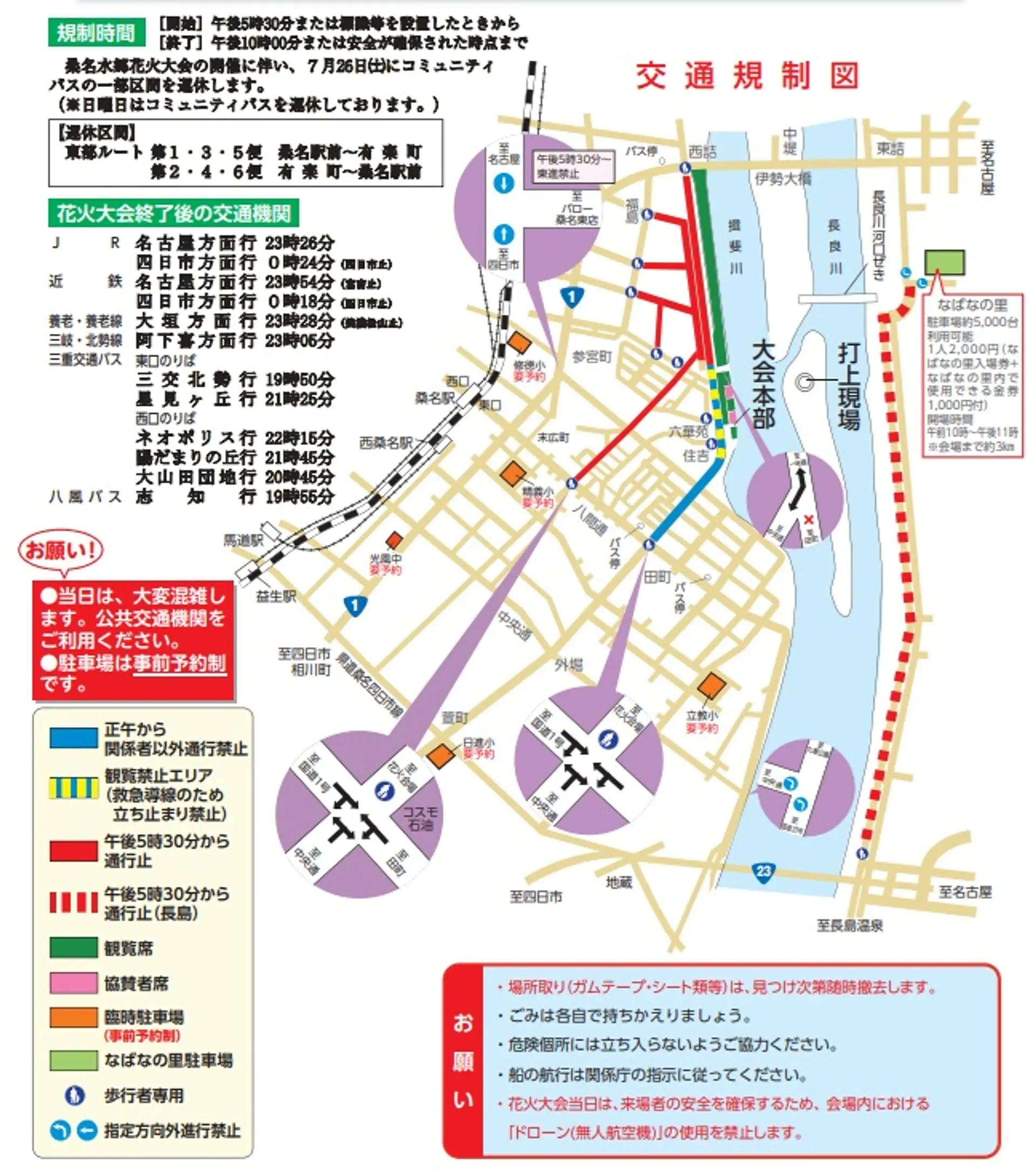 花火大会当日の交通規制は17時30分~22時00分です。(一部エリアは12時00分~23時00分)