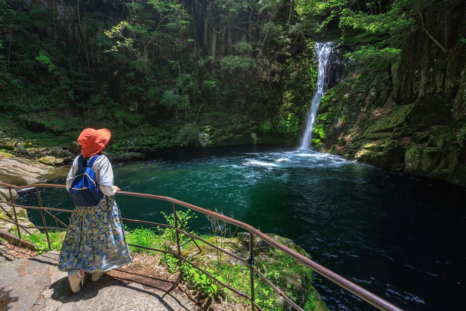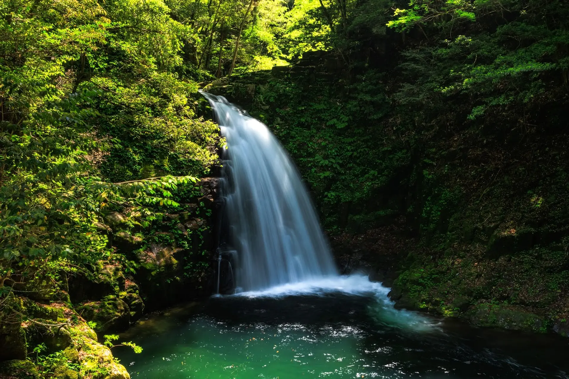 この写真は5月の13時頃に撮影し、滝壺に日光がちょうど当たる時間帯でした。
