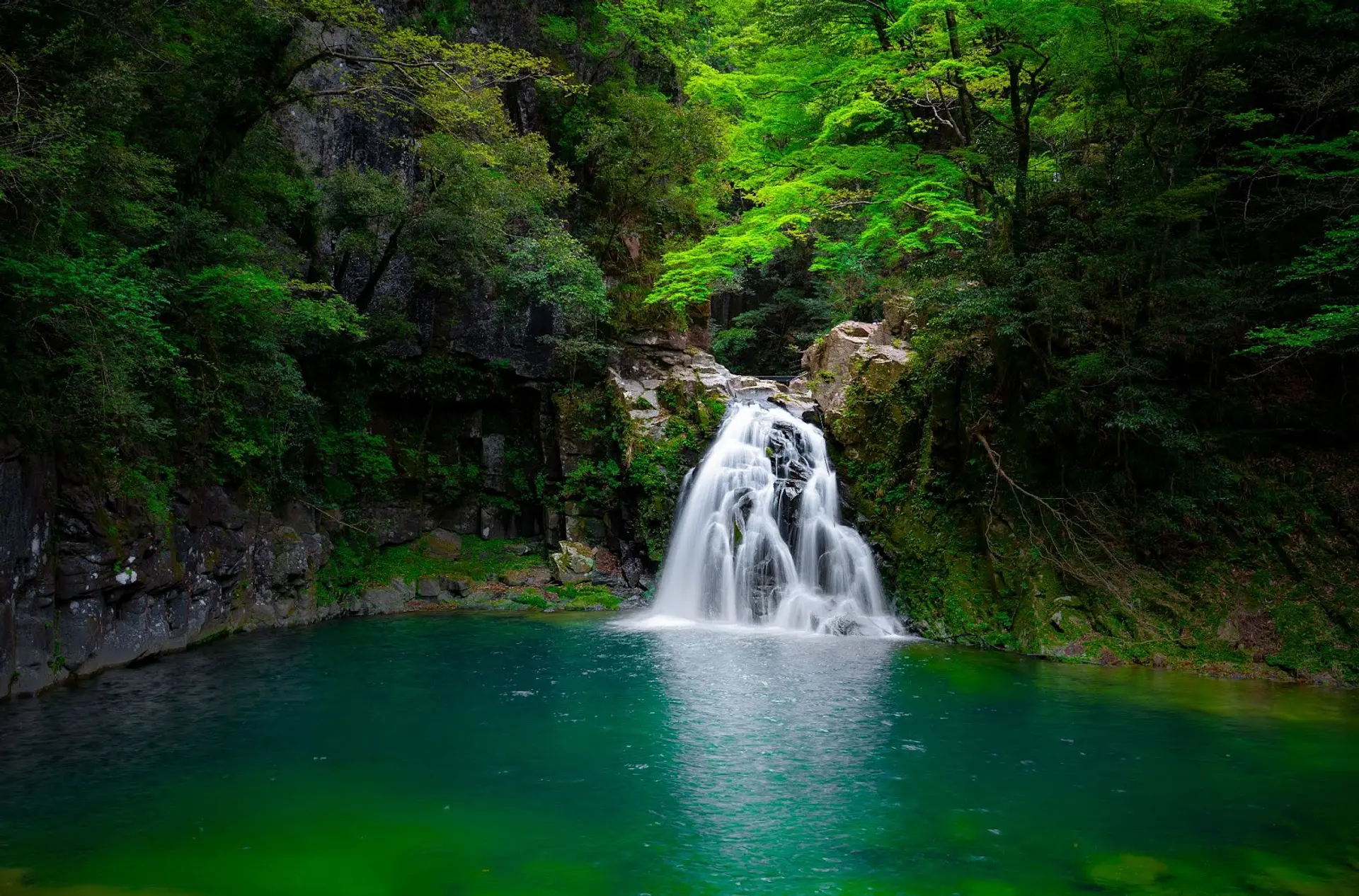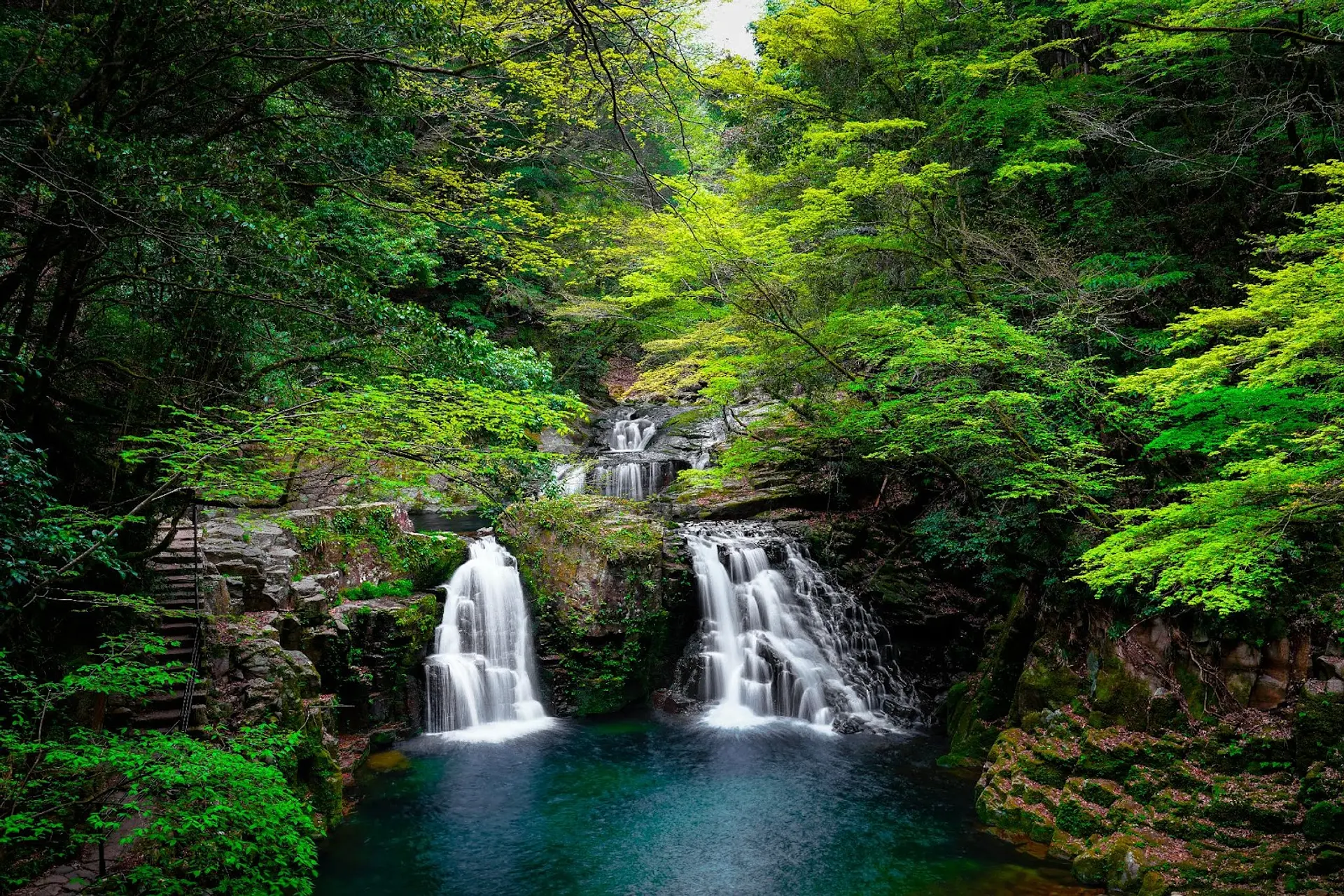 赤目五瀑の中では最も美しいと称される滝で、巨大な岩を挟んで2つの滝が流れ落ちています。