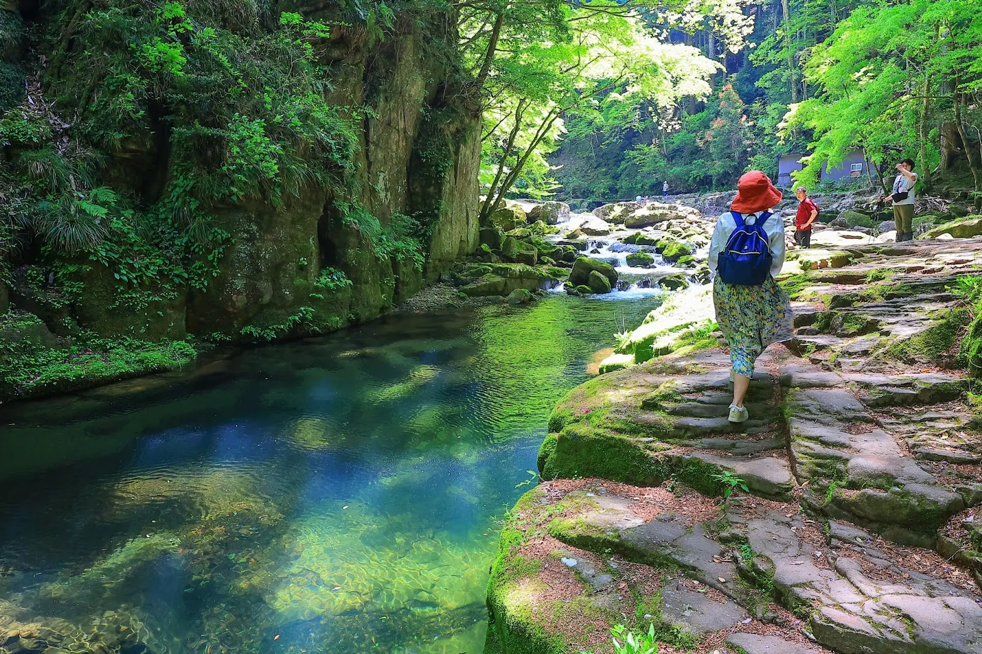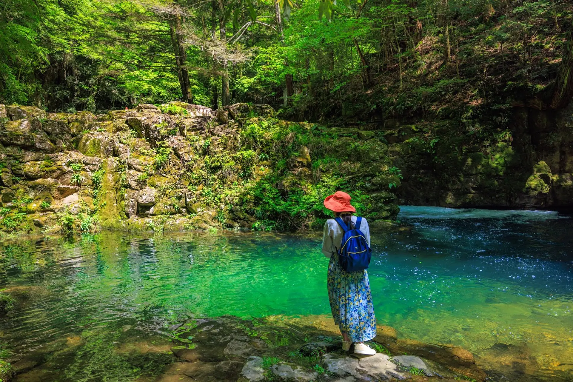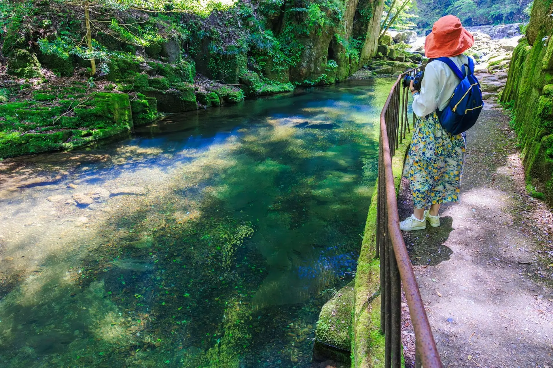 この「滝壺」が魅力的で、日光が当たるとエメラルドグリーンに輝く姿を間近で鑑賞できます。