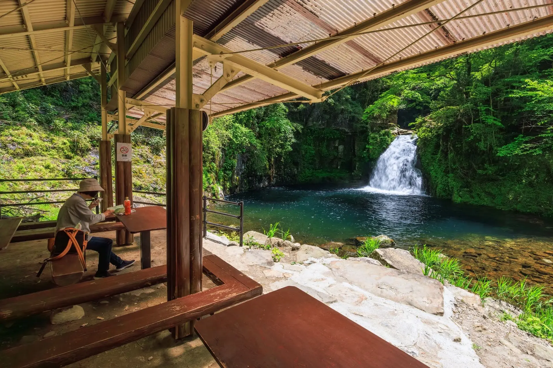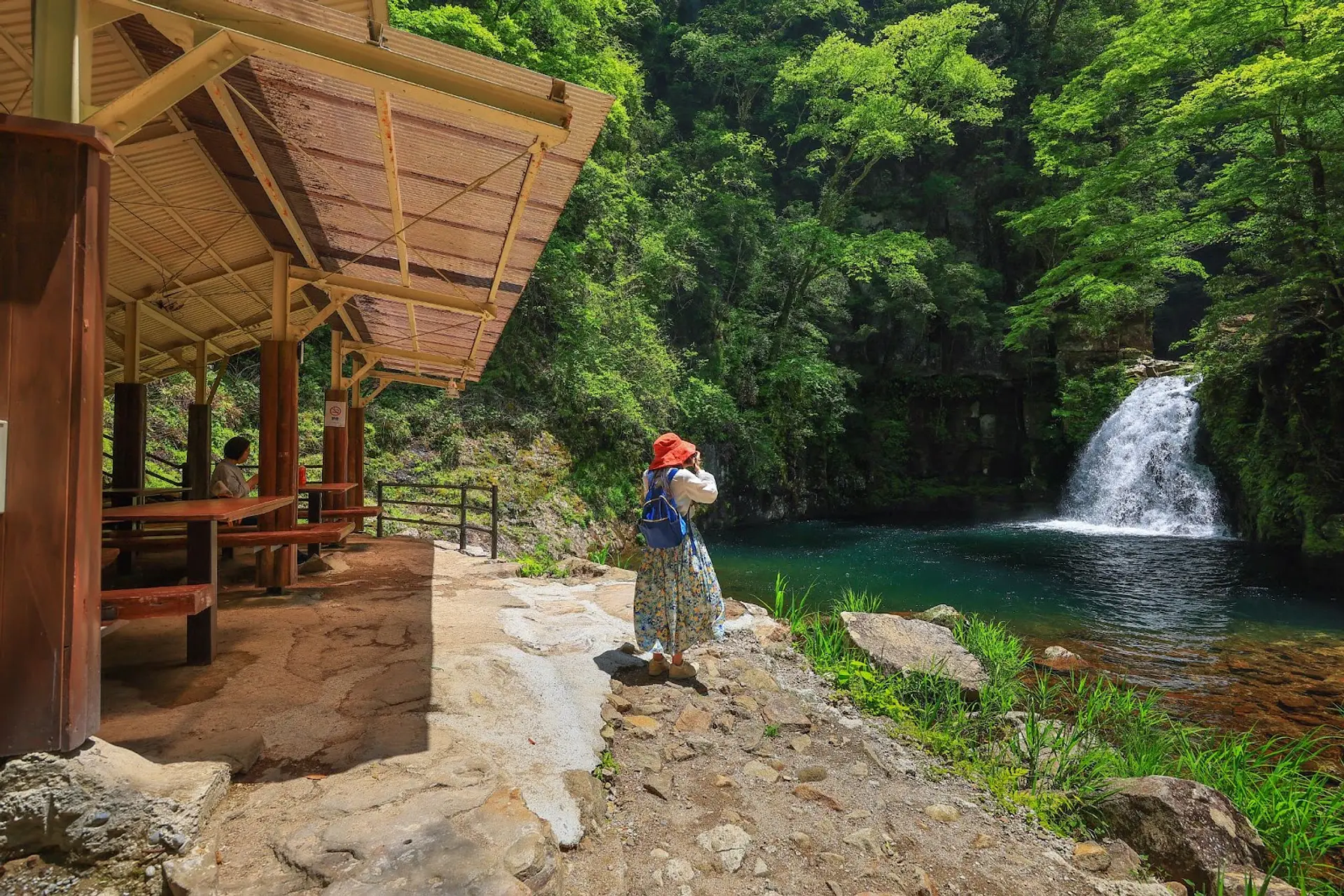 滝壺の近くには東屋が整備されており、屋根の下でベンチに座りながらゆっくりと寛ぐことができます。