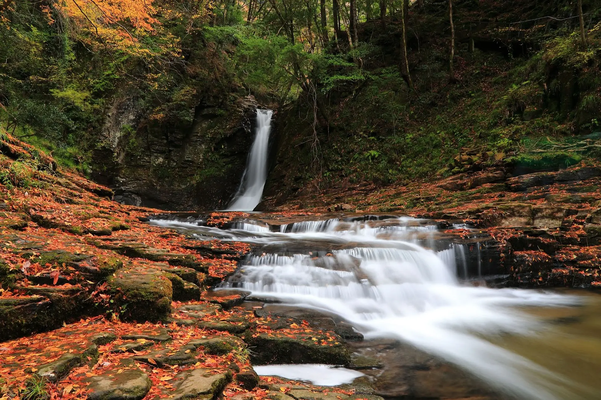 不動滝や荷担滝と比較すると、豪快さでは劣るものの、新緑や紅葉との調和する美しい景観が魅力的です。