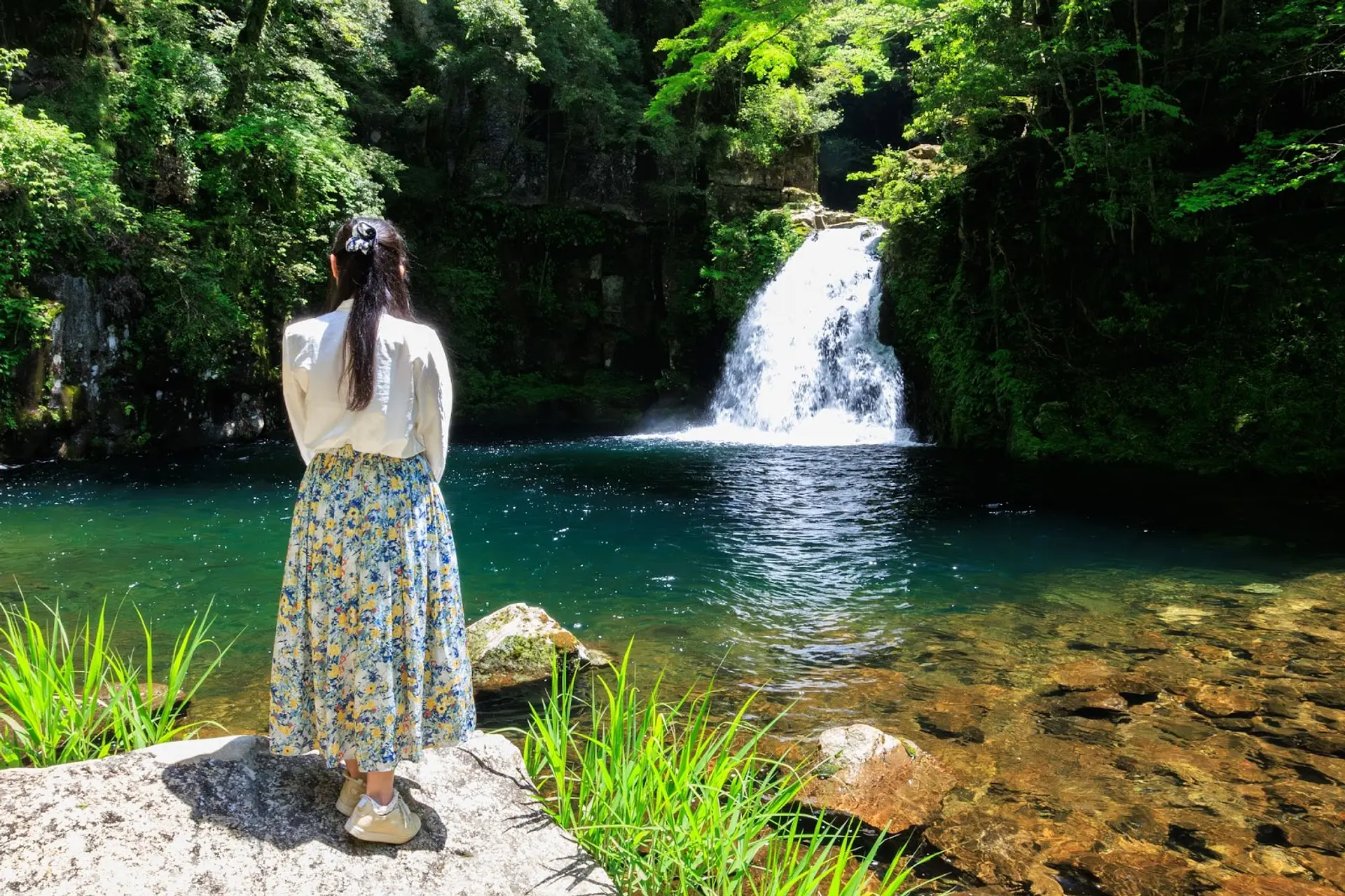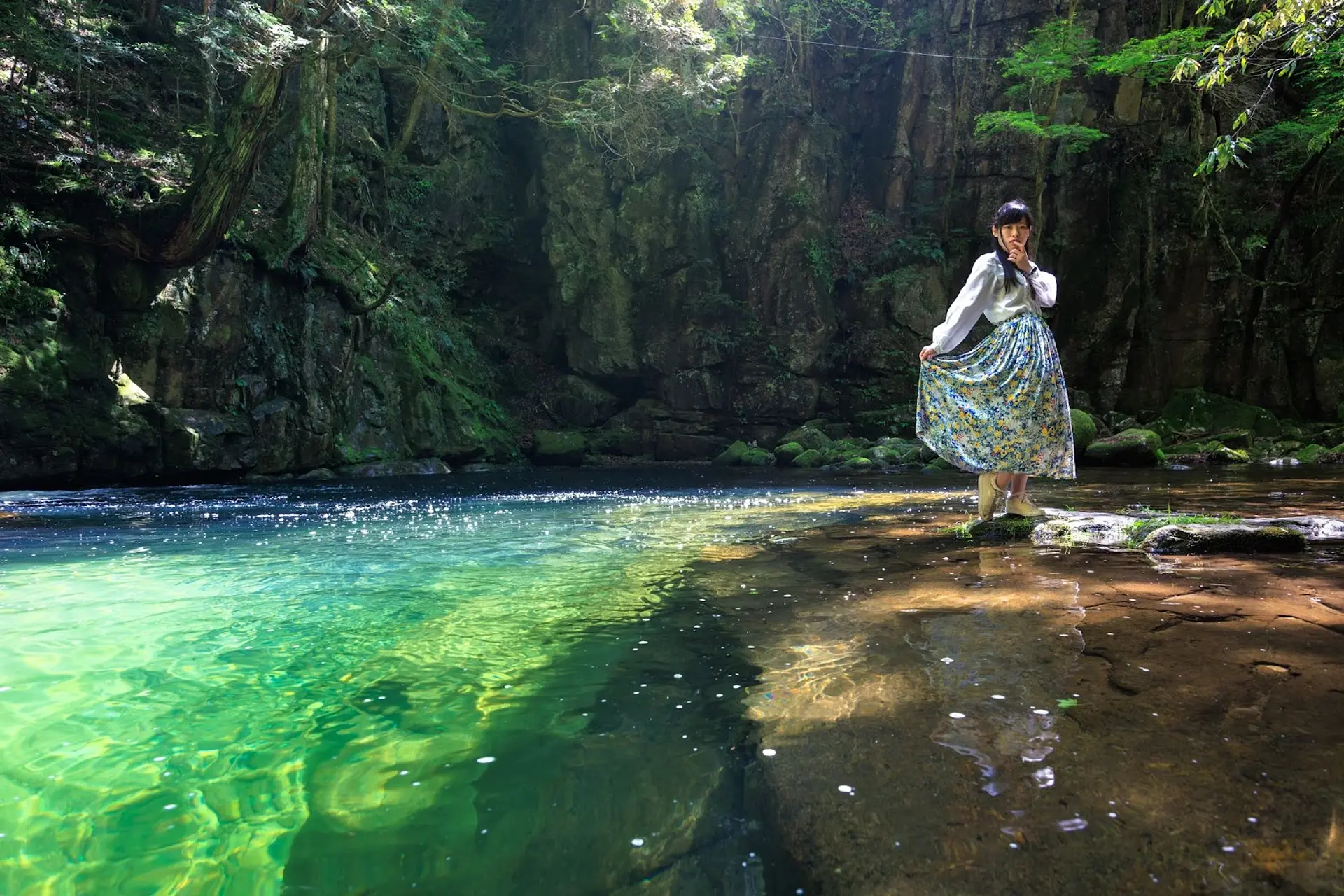 相方を滝壺近くの岩場に立たせ、カメラをローアングルで構えてシャッターを切ったのですが、水上ステージに立つような写真が撮れました。