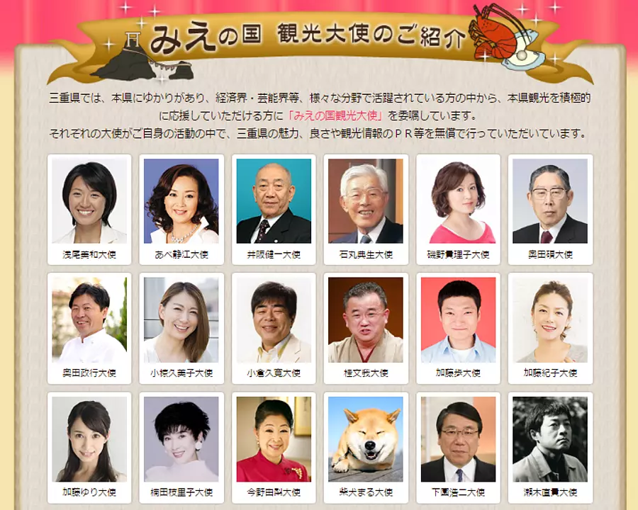 まず、みえの国観光大使とは?本県にゆかりがあり、経済界・芸能界等、様々な分野で活躍されている方の中から、本県観光を積極的に応援していただける方に「みえの国観光大使」を委嘱しています。