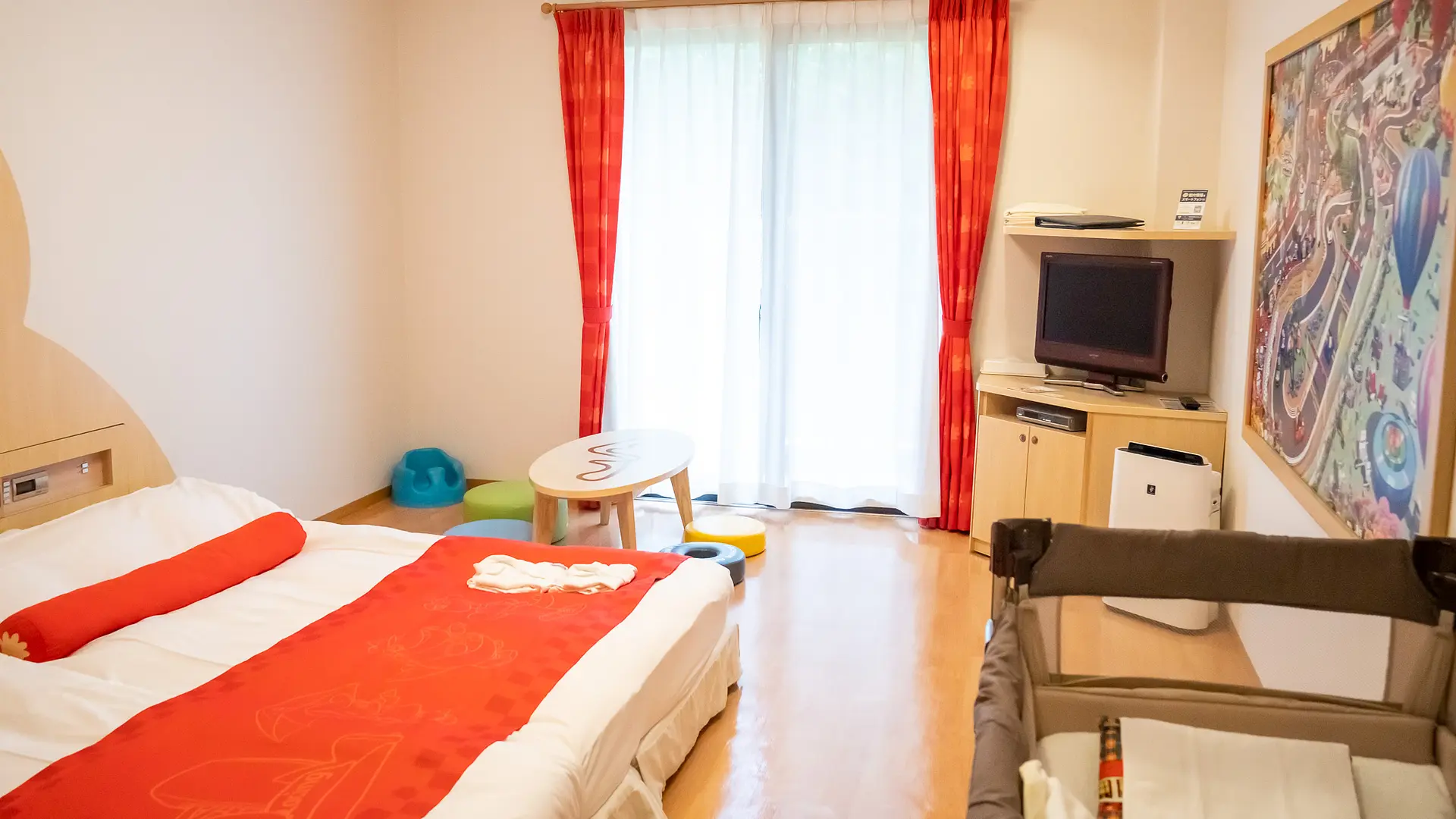 最大店員5名の部屋は、小さい子ども連れの私たちでも安心して泊まれる可愛いデザインのお部屋。