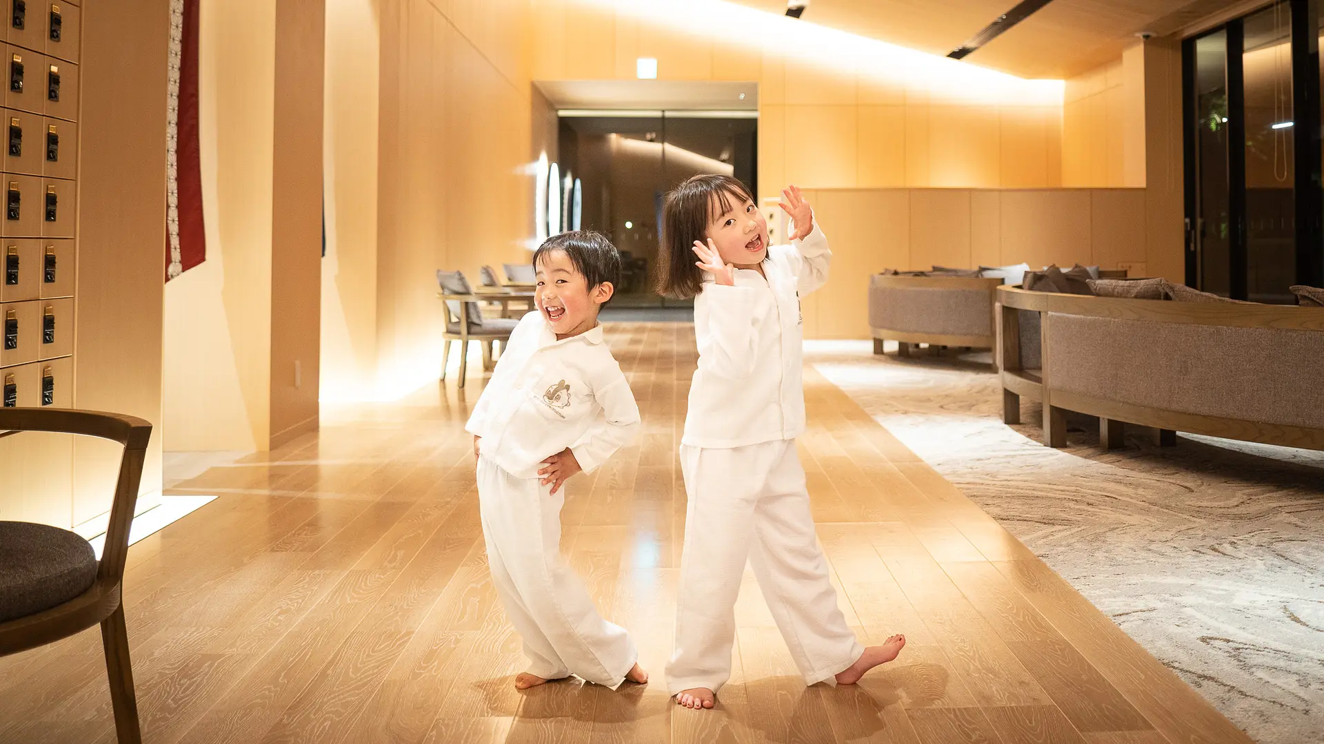 可愛いキャラクターが描かれた部屋着に着替え、木材の温かみが広がるロビーでくつろいでいました。