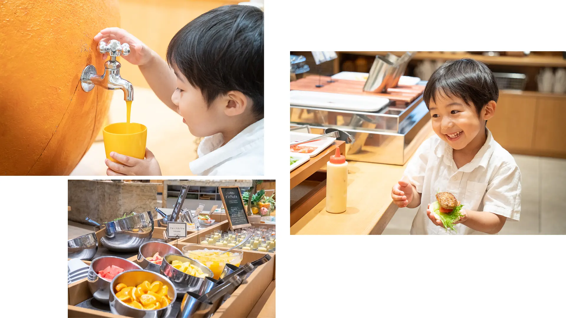 蛇口から出るオレンジジュースや、オリジナルのハンバーガーを作ることができるバイキングに、うちの子たちは目を輝かせていました。