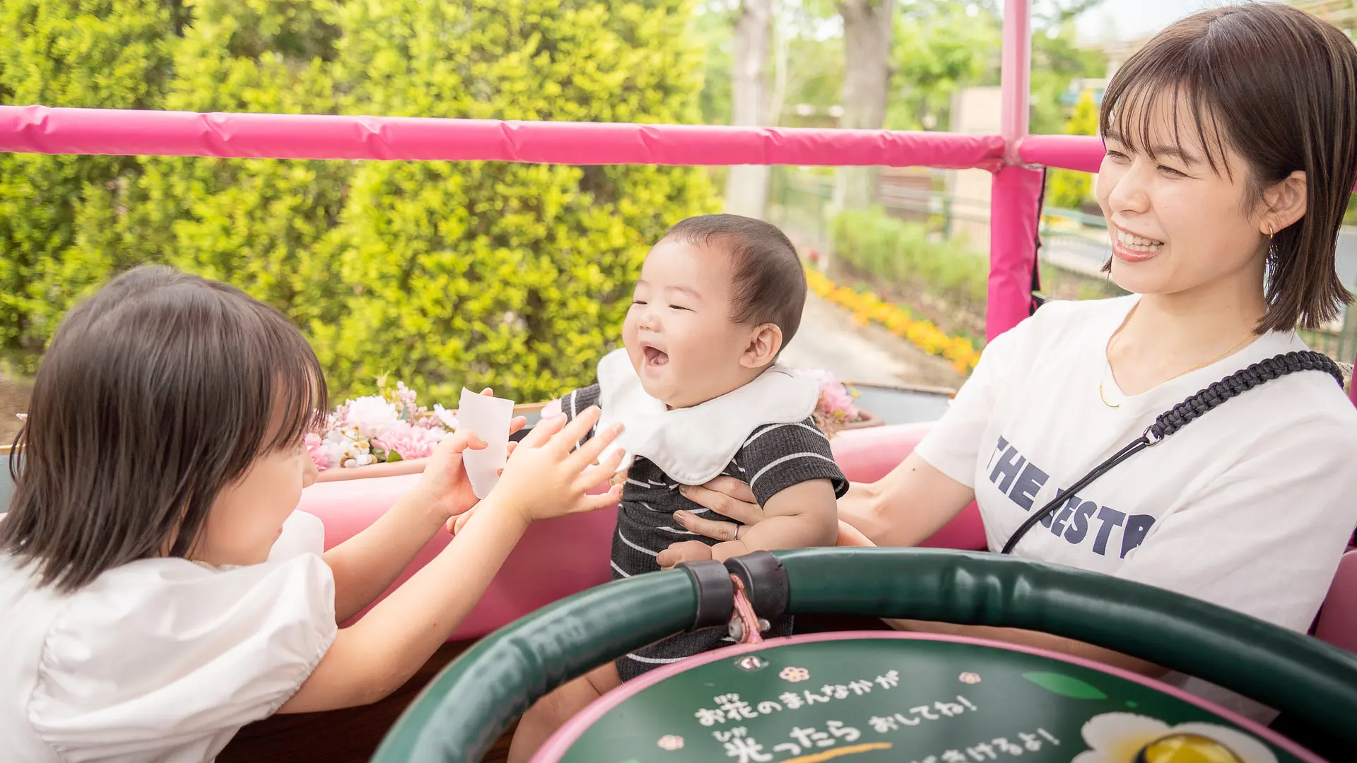 家族でワゴンを操作しながら、育っていくお花の中を巡ります。