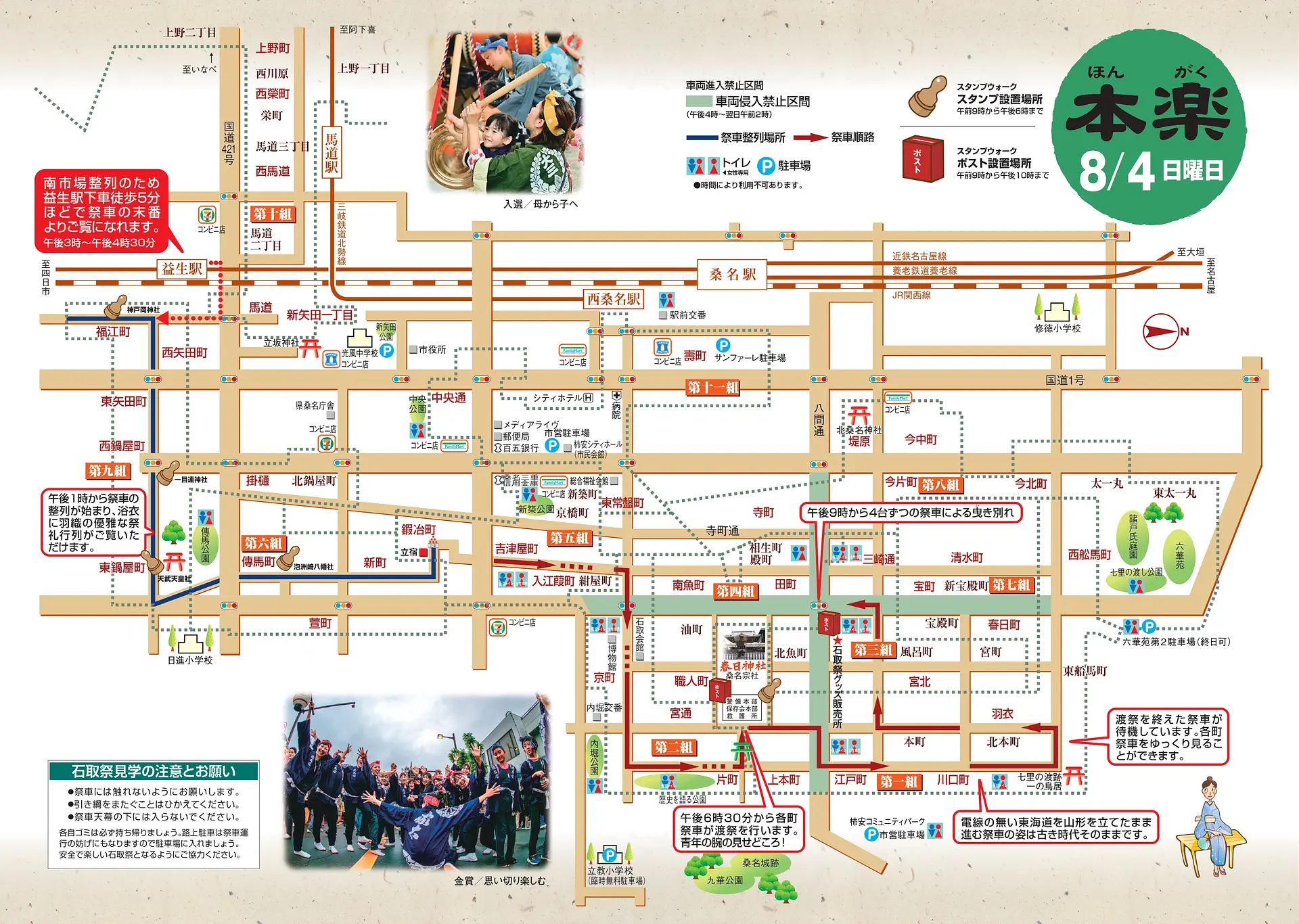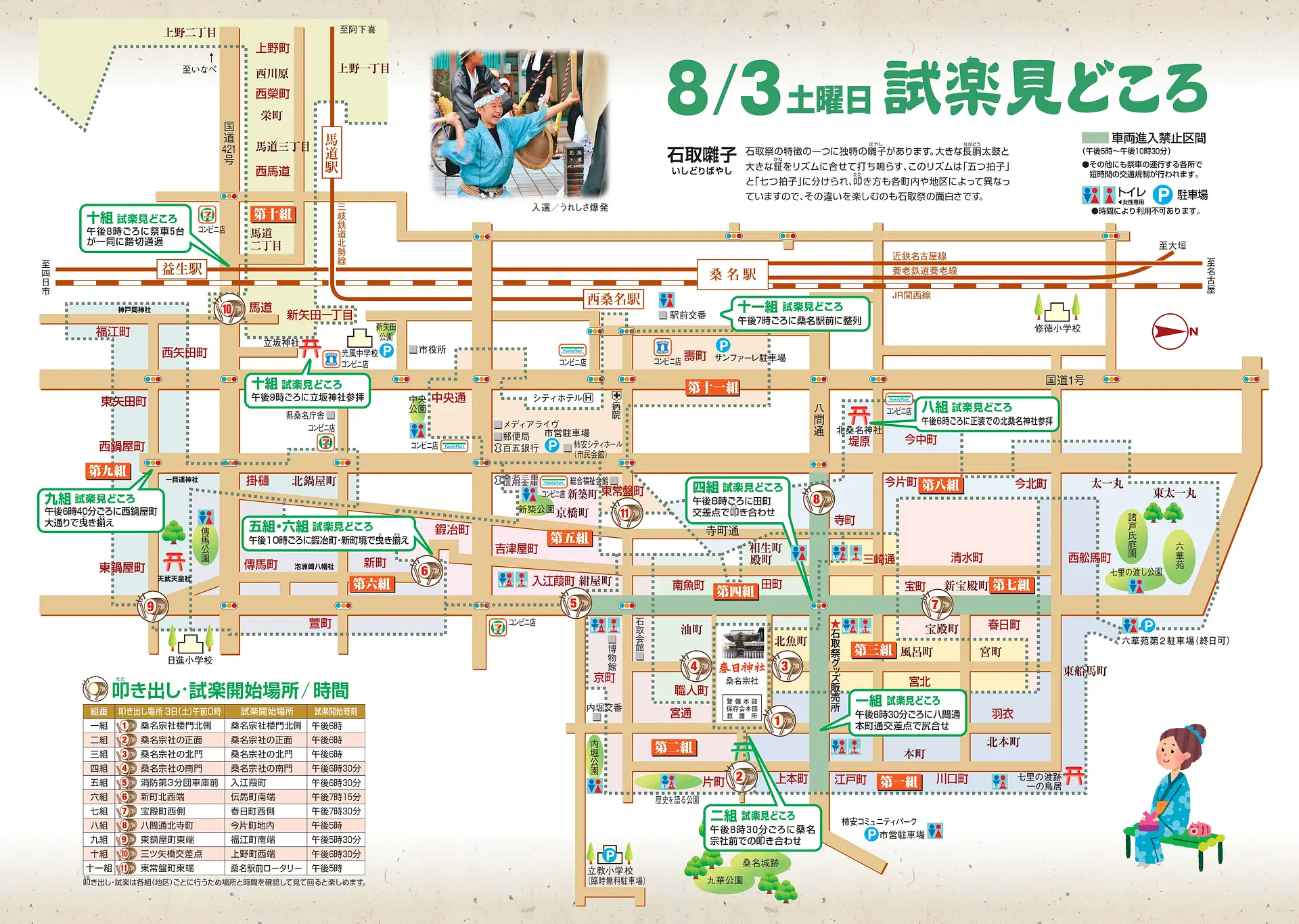 桑名石取祭の行事の中心は、8月第一日曜日に行われる本楽(ほんがく)とその前日の土曜日の試楽(しんがく)です。この前後にいくつか神事などがありますが祭車の巡行はこの二日間行われます。