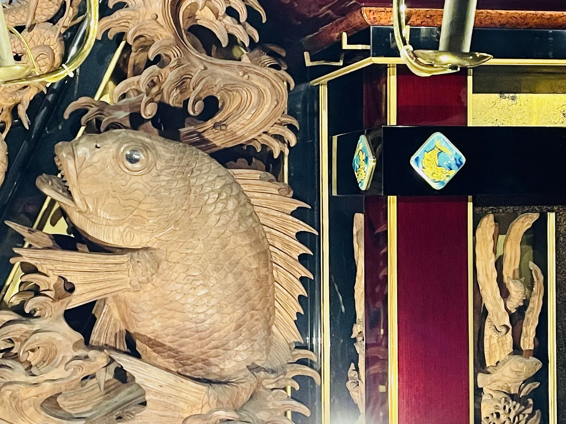 ほとんどの石取祭車には彫刻、装飾金具、蒔絵や漆塗りが施されています!彫刻では明治大正期に活躍した高村光雲作のものもあり、その豪華さから”動く美術館”と呼ぶ声もあります。