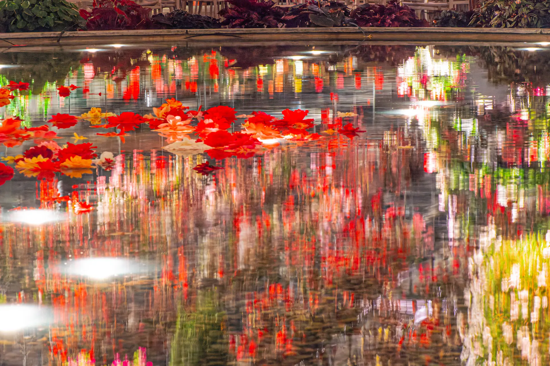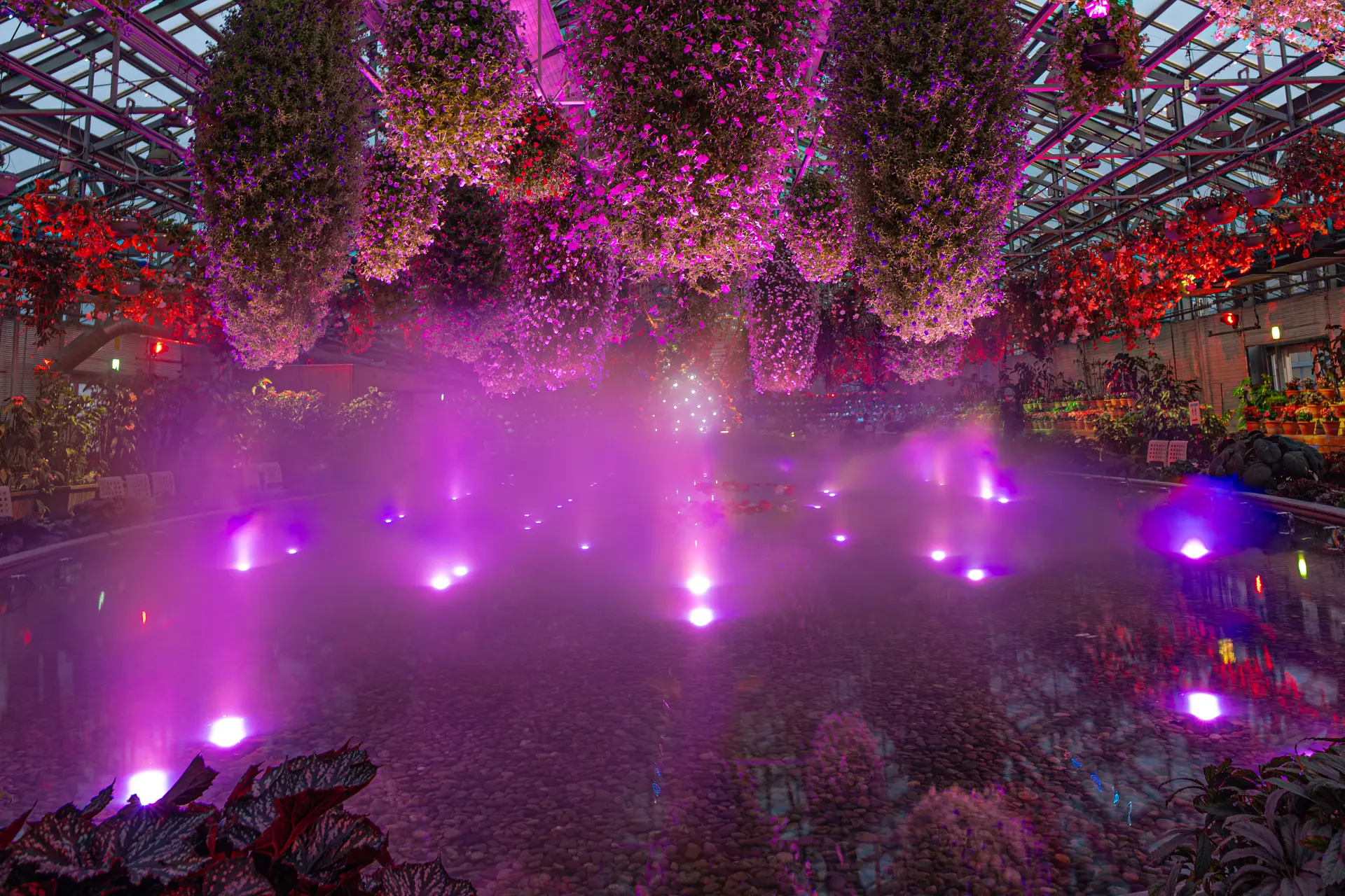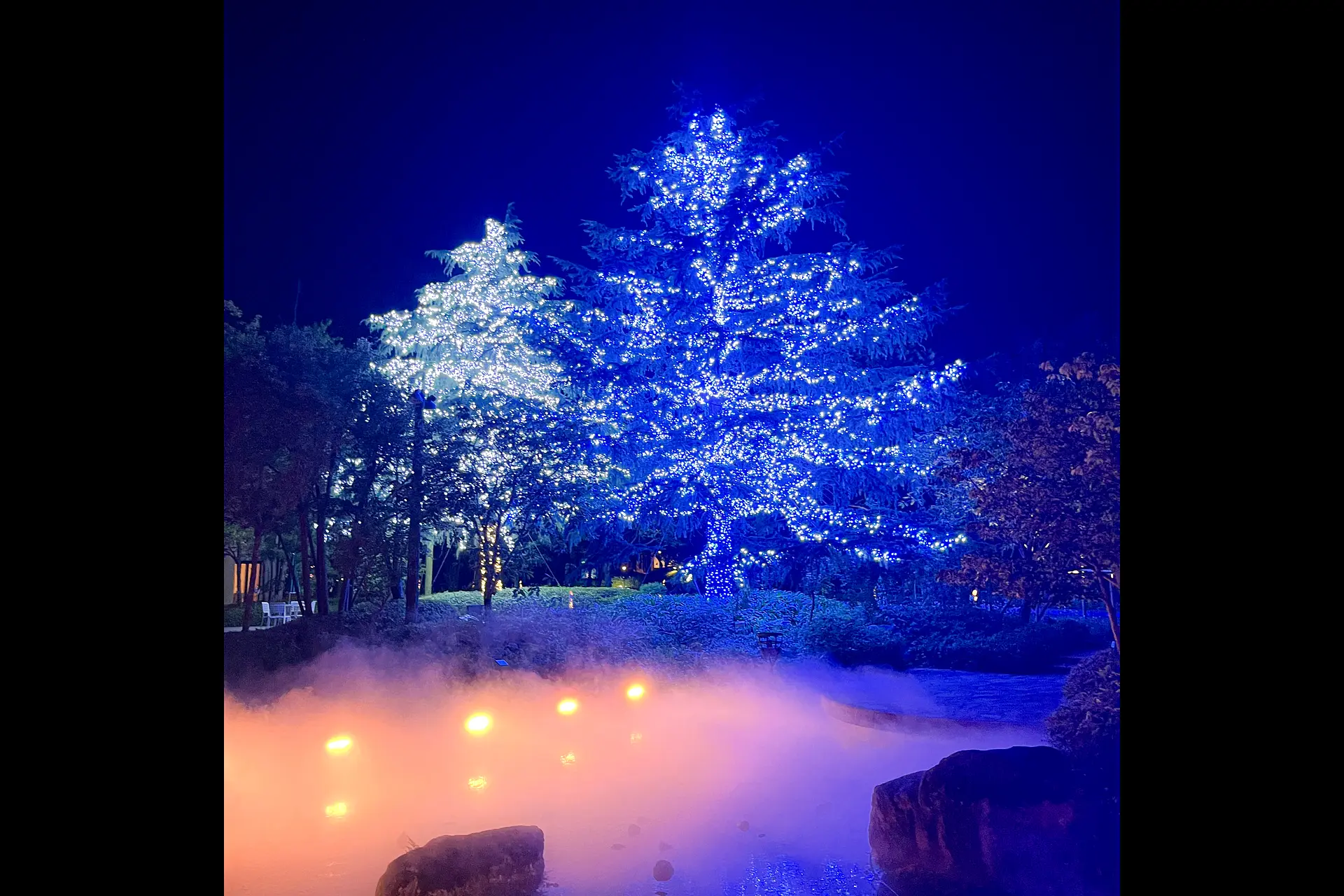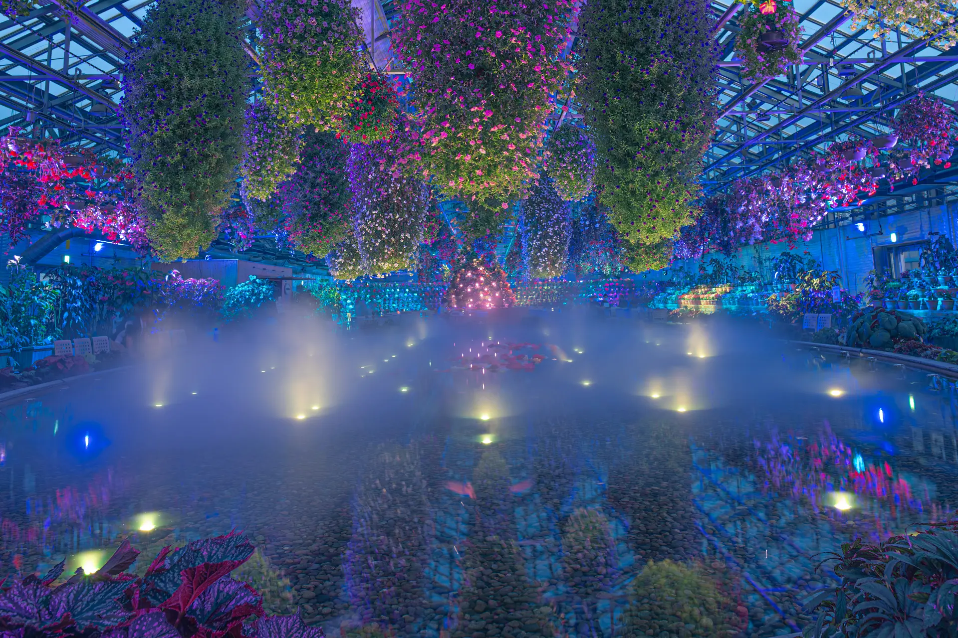 ベゴニアガーデン(入館料別途)において、「ベゴニアナイトカーニバル」と銘打った特別イベントが開催されています。咲き誇る花々と音楽、光の演出が見事に融合し、幻想的な世界が作り出されています。昼間でもインスタ映えスポットとして有名な池には、ベゴニアとツリーが水面に映し出され、涼しげで美しい光景が広がっています。特に色鮮やかな約300鉢の花々で作られた高さ5mのスペシャルなツリーは、全体を彩るライトアップと相まって、リフレクションする光景が圧巻です。ここには全国屈指のイルミネーション演出の技術が感じられます。ぜひ皆さんにも体験していただきたいイベントです。