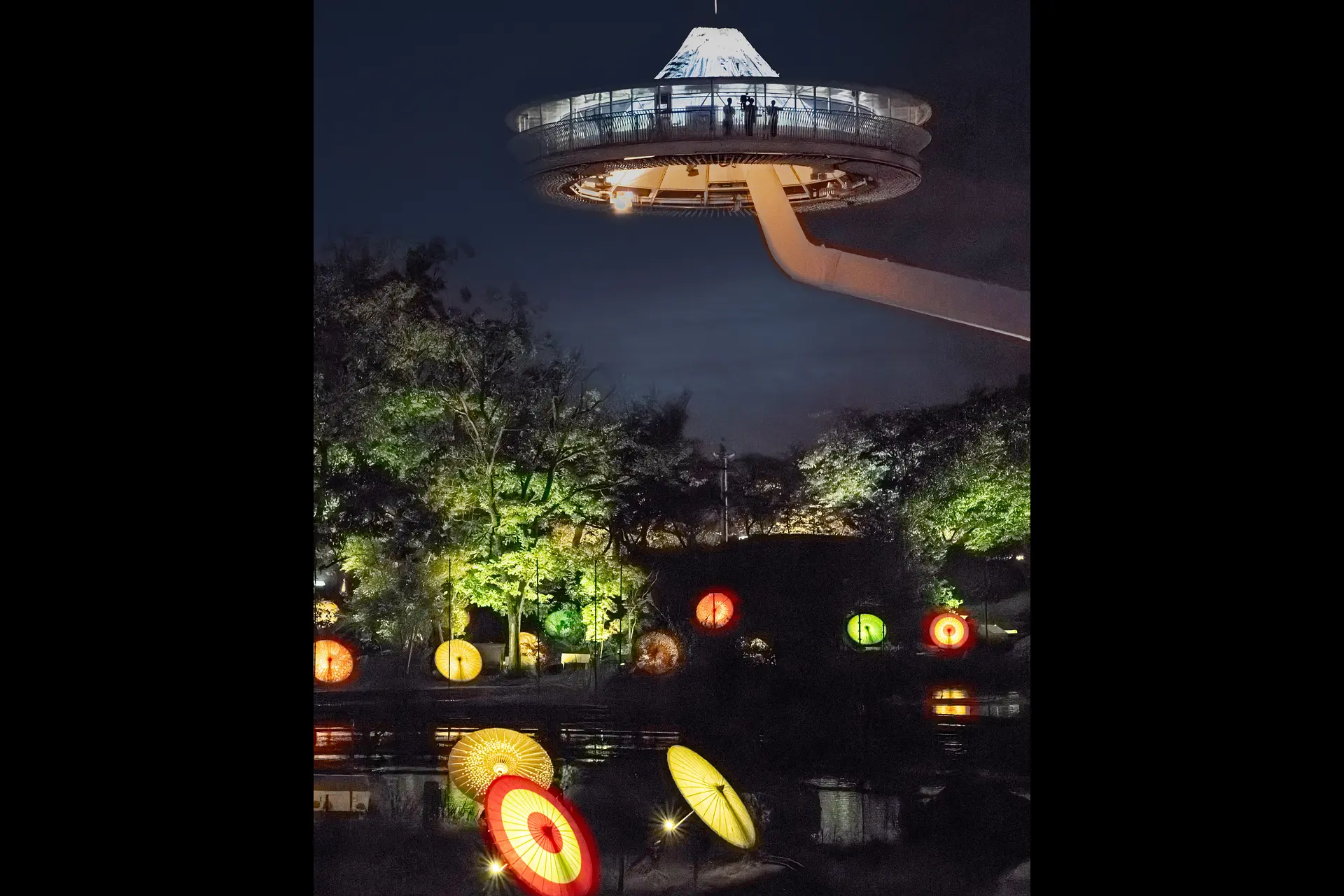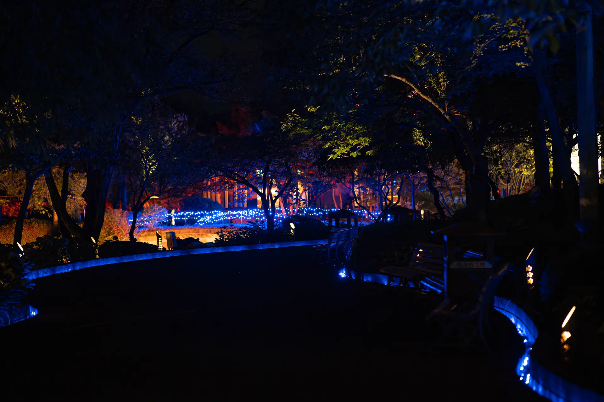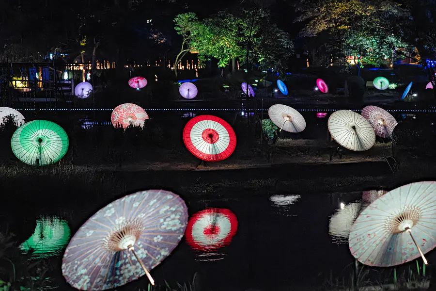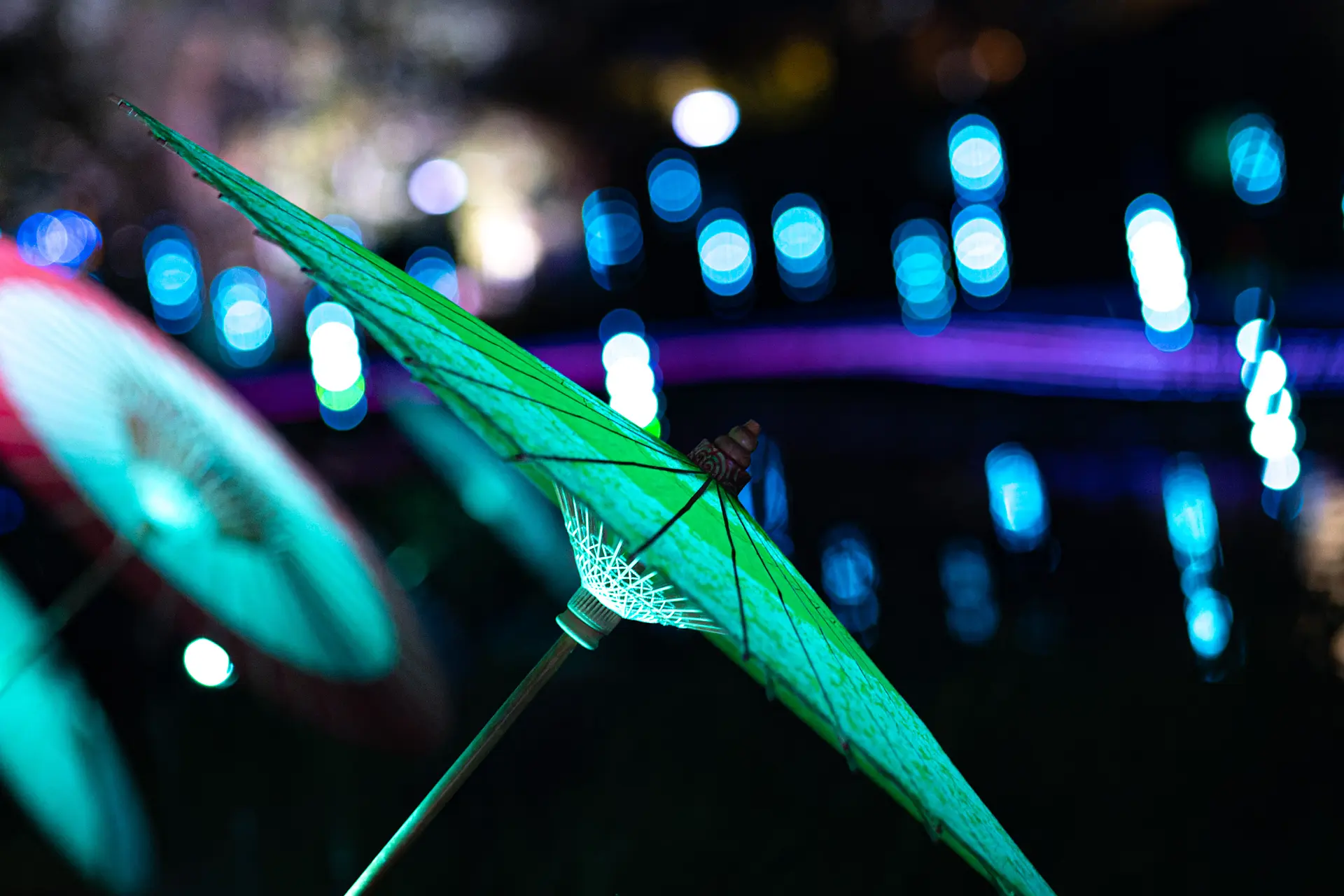夏の夜に、色鮮やかな和傘が浮かび上がり、幻想的な光景が広がっていました。和傘特有の日本美が、夏のイルミネーションの風景と融合し、光の芸術を楽しむことができました。