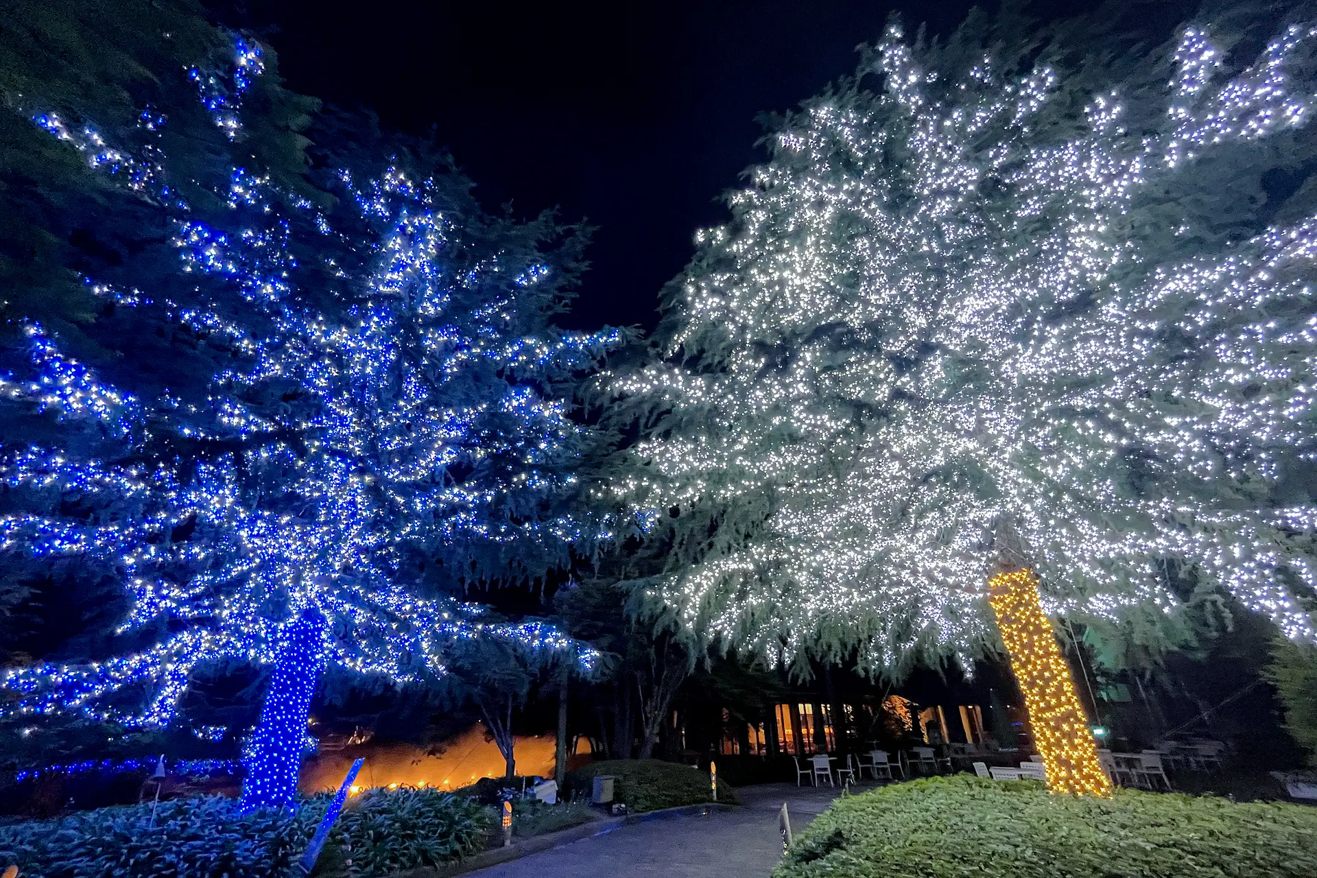 チャペルの前には2本のシンボルツリーがあります。高さ約20mのヒマラヤスギはクリスタルホワイトに輝き、ゴージャスな雰囲気を醸し出しています。また、パステルブルーに染められた優雅なツリーも人気のフォトスポットとなっています。