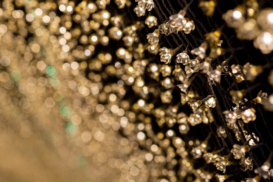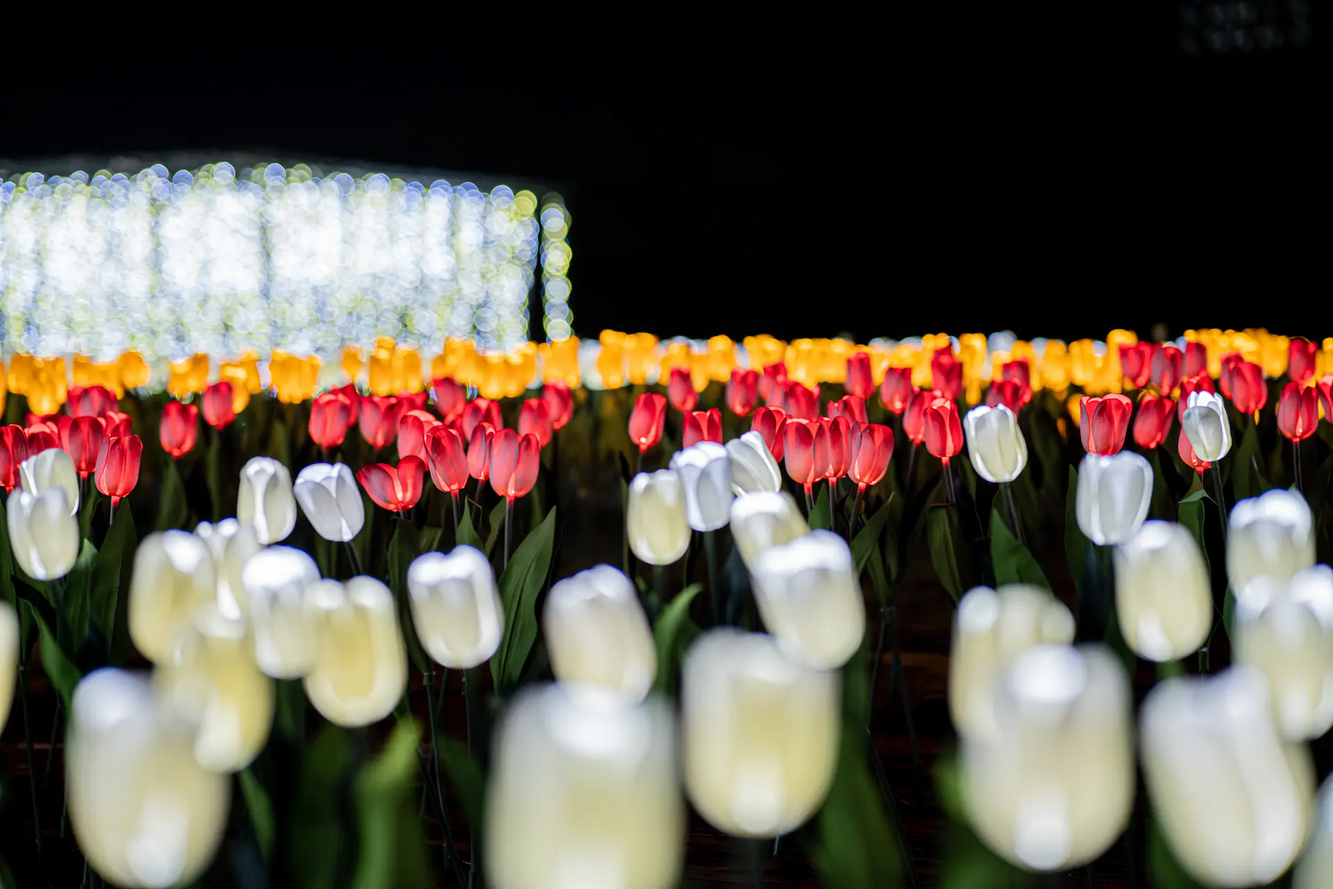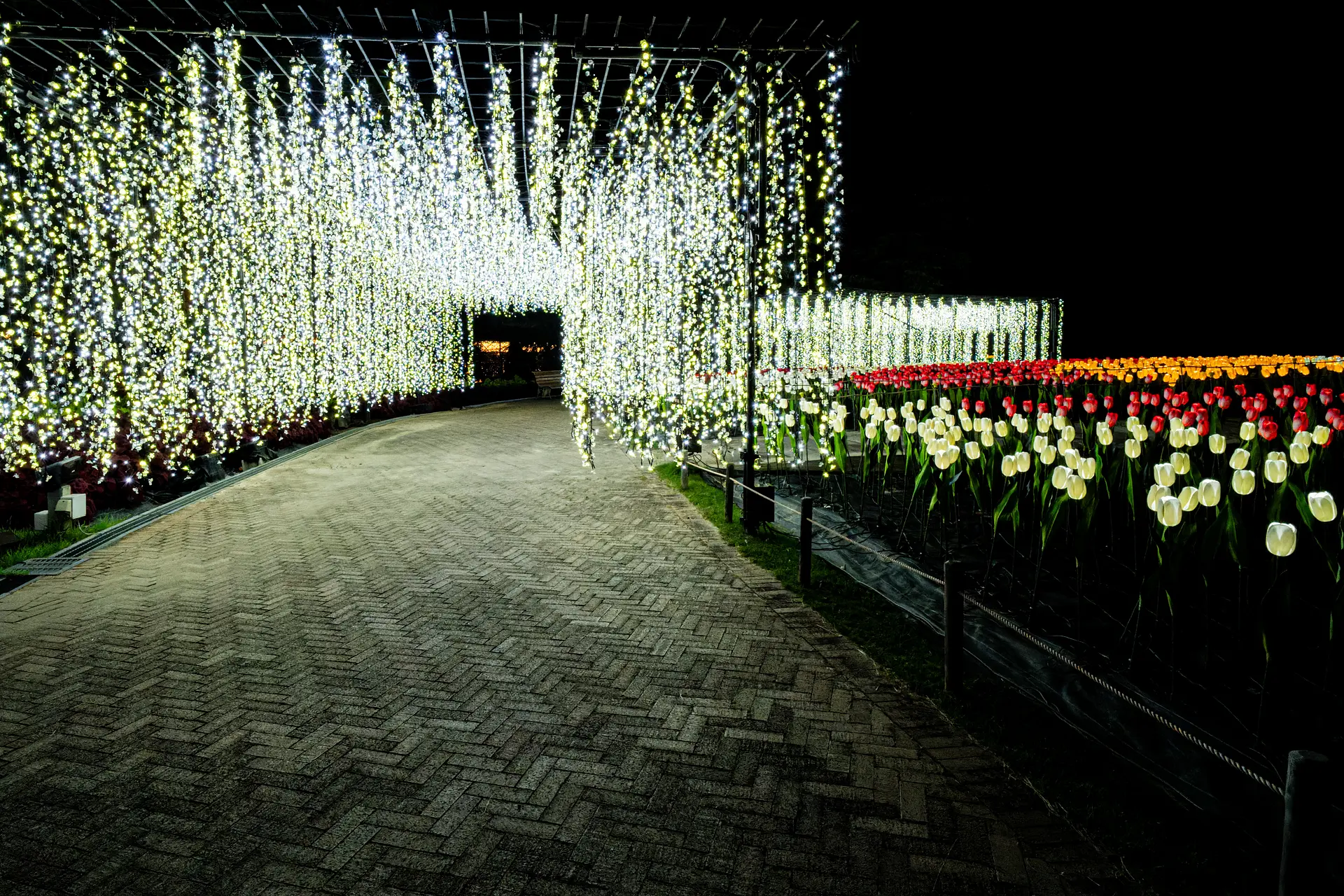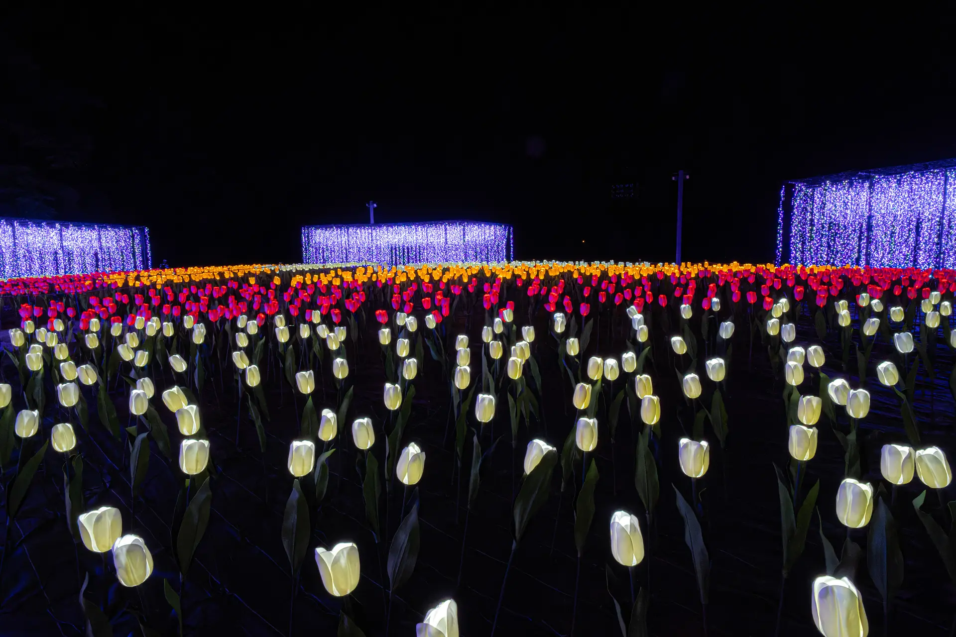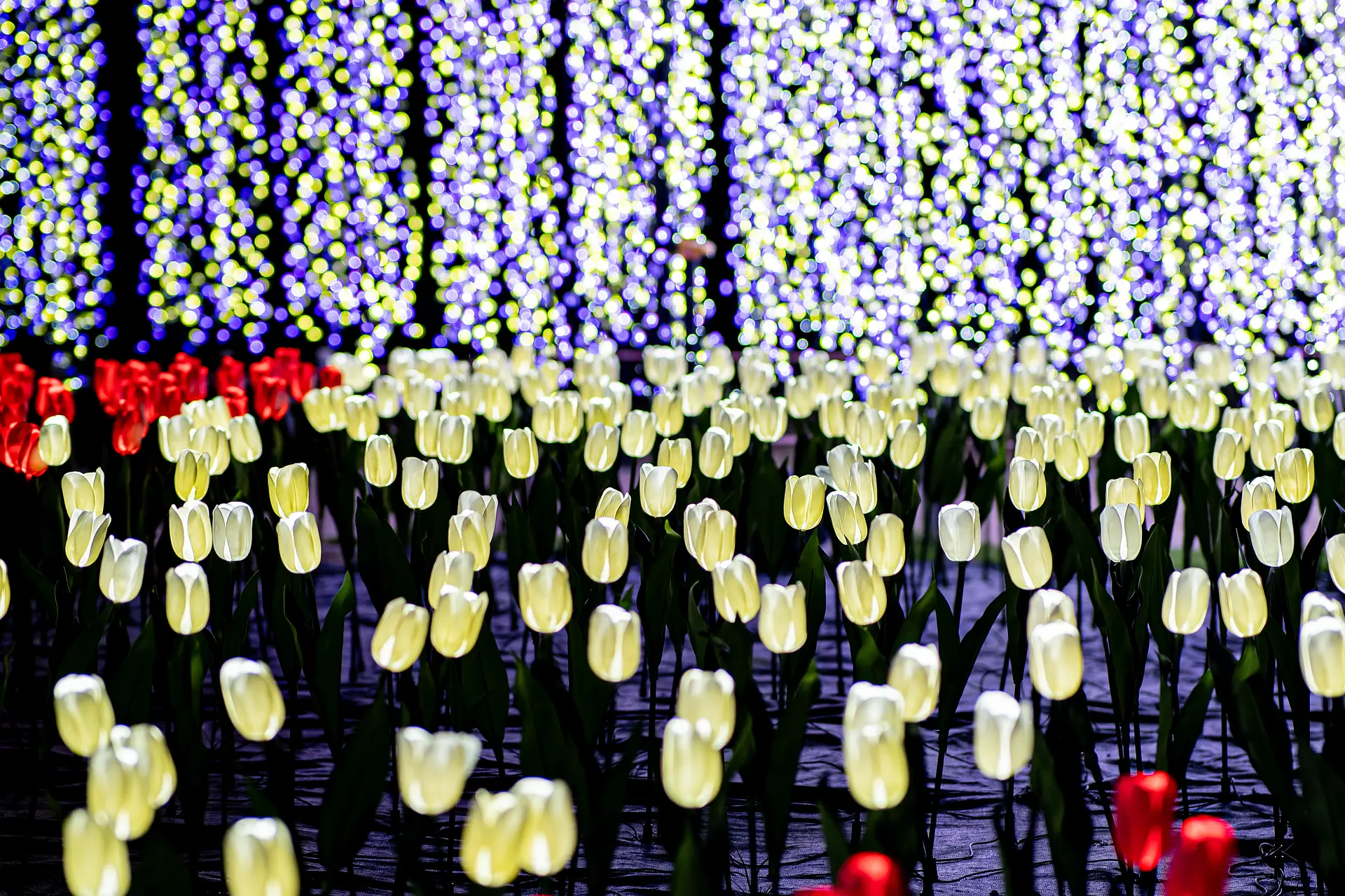 トンネル状に作られた無数の星がキラキラと輝き、幻想的な空間を作り出しています。その手前には、鮮やかな色合いのチューリップのイルミネーションがあり、まるで非現実の世界に迷い込んだかのような気分にさせられます。輝くチューリップたちに心を奪われます。