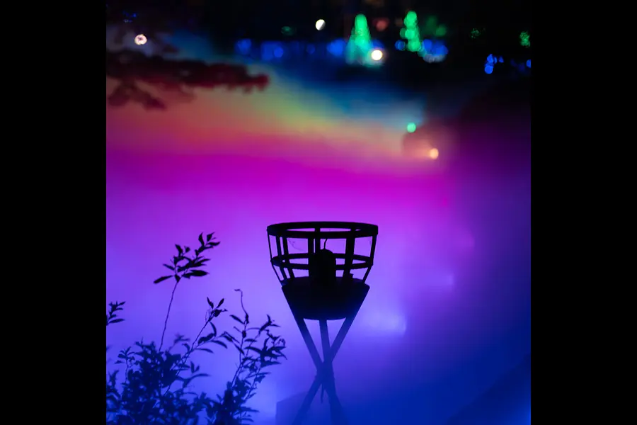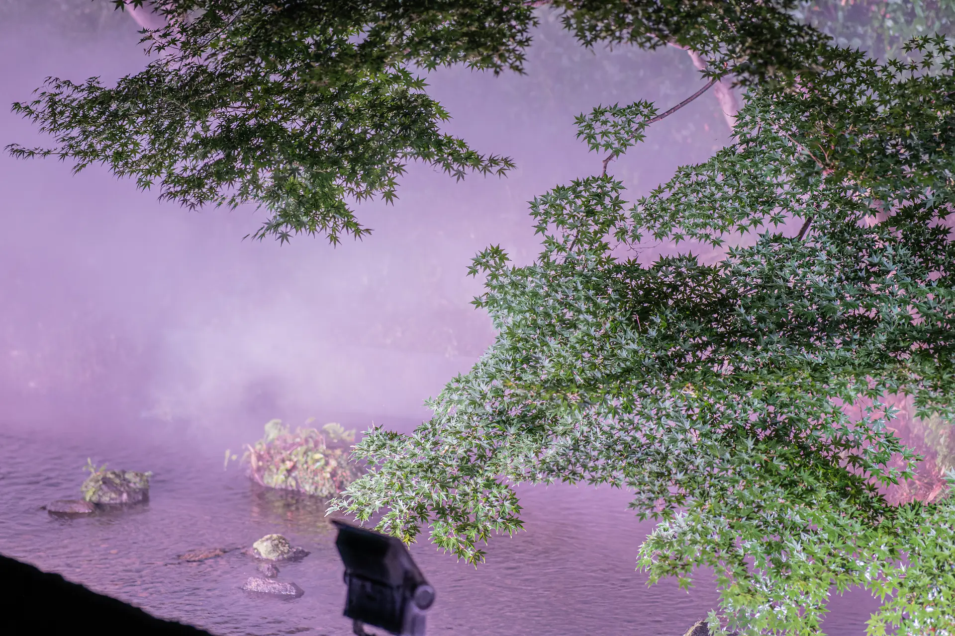 樹齢1000年のオリーブの大樹が色鮮やかなライトアップで彩られています。複雑に曲がりながら縦横にうねりを見せる太い幹や、ピンと伸びる枝は独特なシルエットを描き出しています。ライトアップに加え、人工的に霧や雲を演出し、まるで雲の上にいるかのような体験も楽しむことができます。