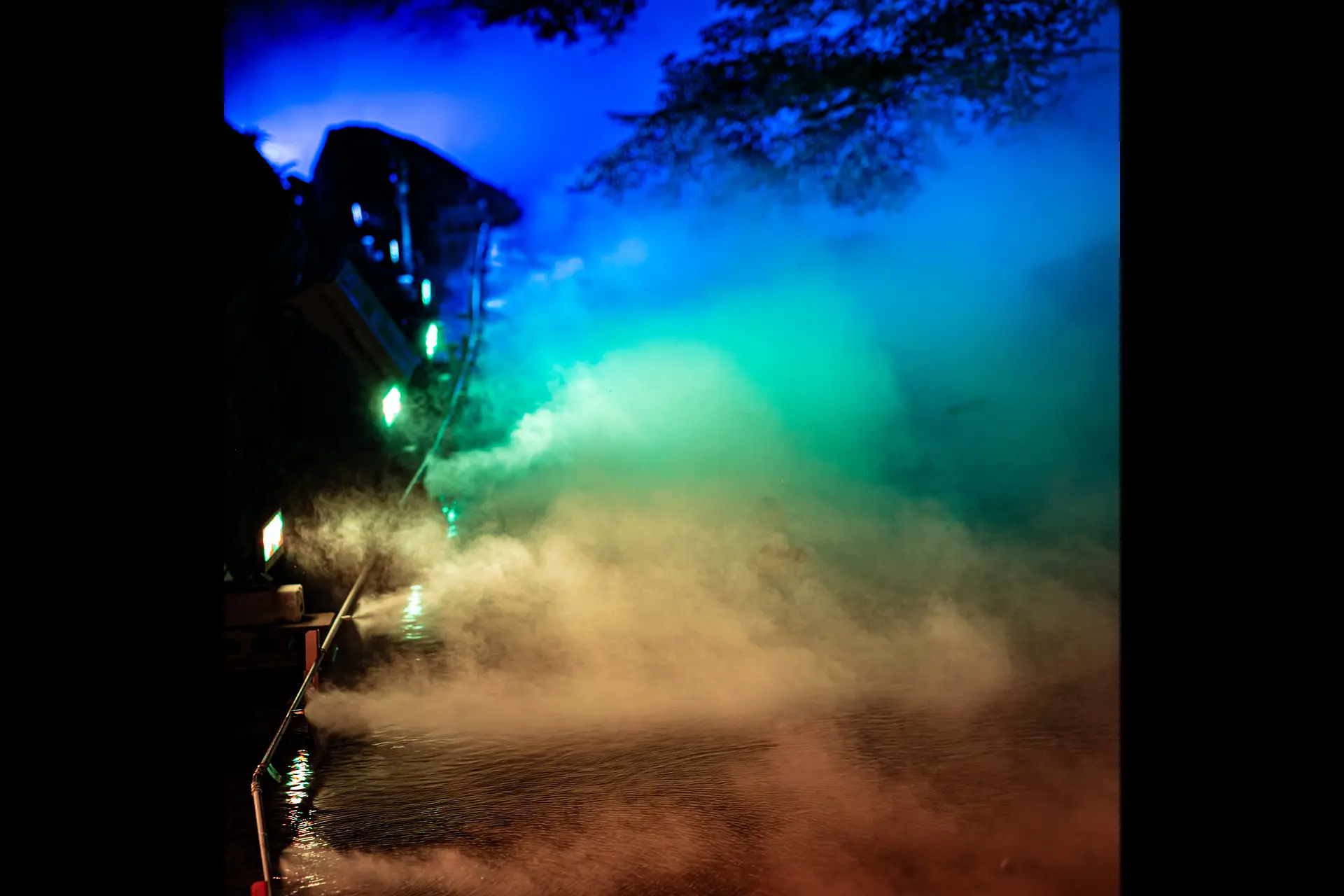 音楽にあわせて光のショーが行われます。霧がでてきて幻想的な光景に。