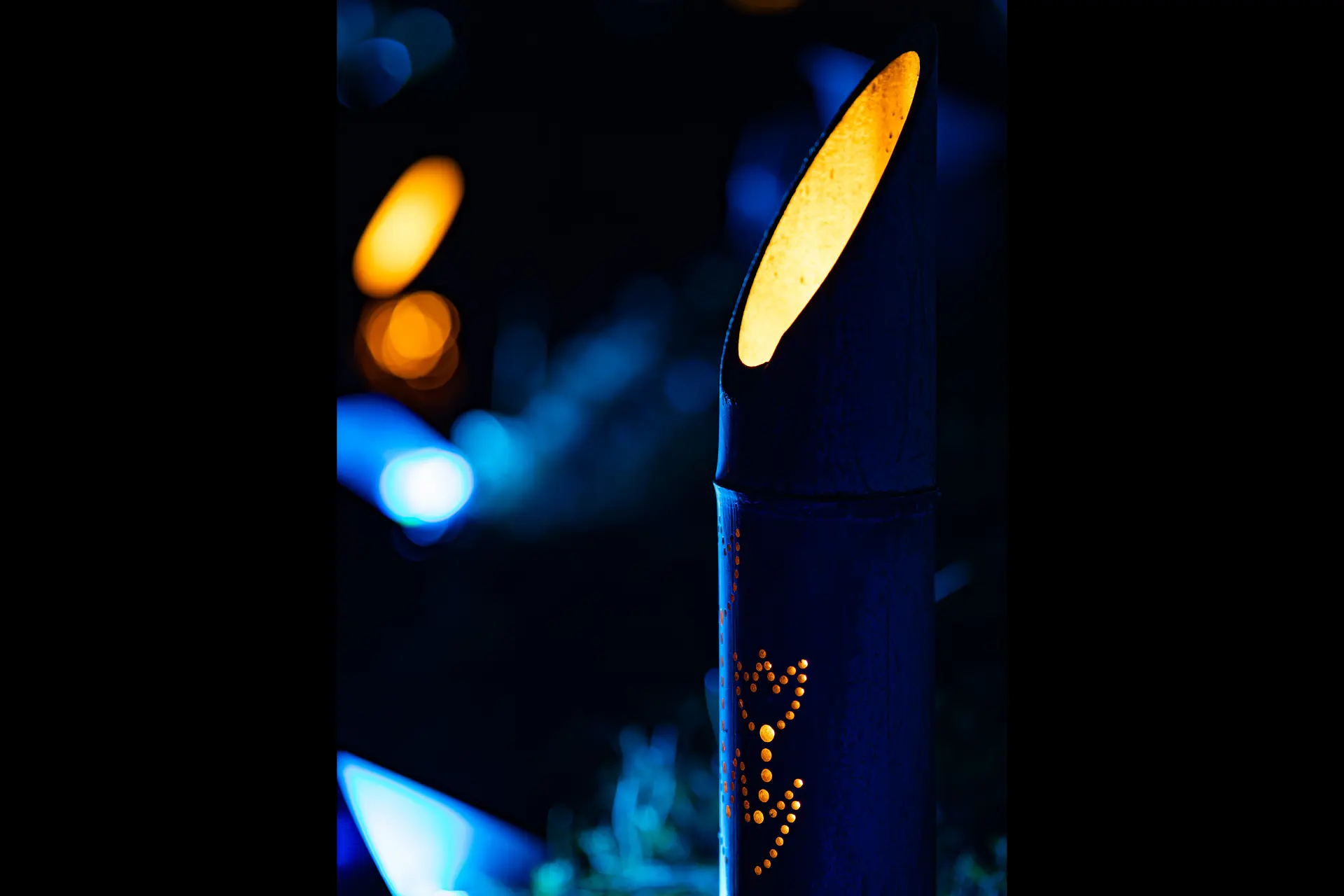 幻想的な光に包まれ、夢のような雰囲気が漂う『竹の丘』の魅力は、遠くから眺めるだけでなく、近くでゆっくりと竹灯籠を眺めることもおすすめです。手作りの温もりが伝わり、訪れる人々の心を癒してくれます。