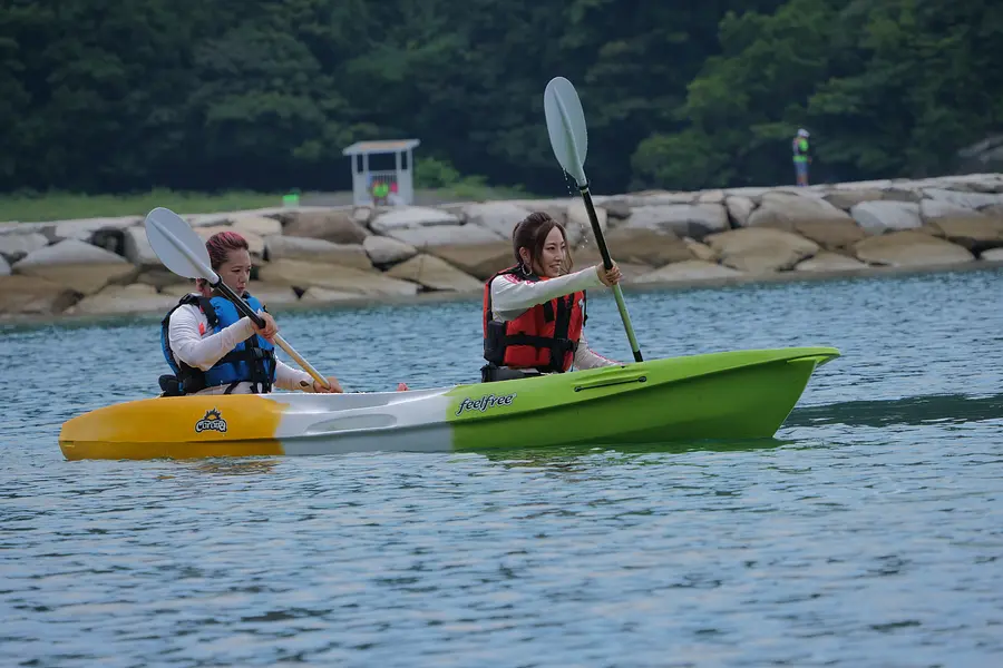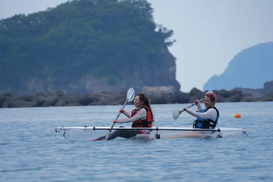カヤック船に座り、パドルを漕いで海上を進んでいくアクティビティ、シーカヤック。