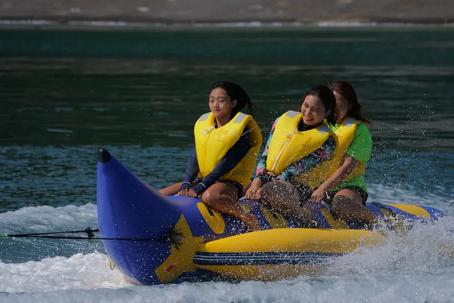 インストラクターの水上バイクに繋がれ滑走する、チューブ。