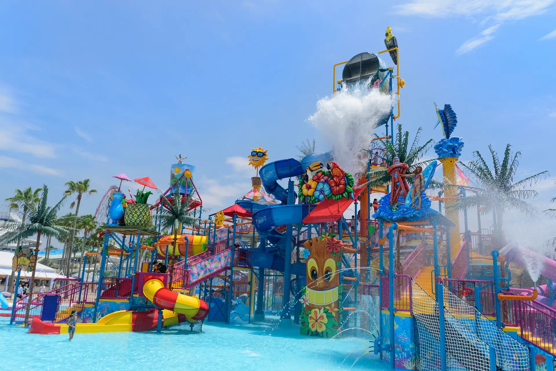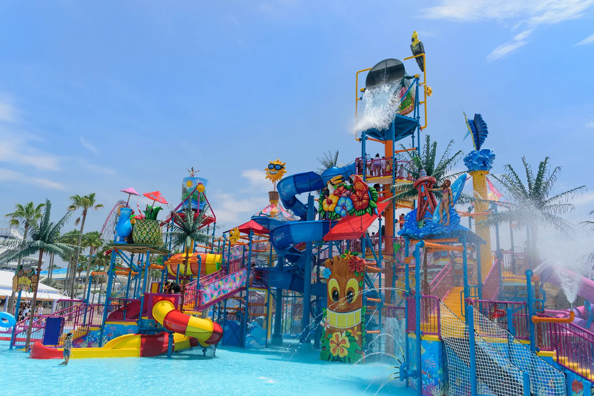 桑名市ご来場の際は最新の営業状況やお客様へのお願いなどを公式HPにてご確認ください。 ジャンボ海水プールの最新情報はこちら>>(公式ページ) 総面積75,000㎡の広大な敷地には、キッズから大人まで夏を満喫できるプールやウォータースライダーの豪華ラインナップが勢揃い! 日本で唯一の「超激流プール」が超人気です!(2018年登場) 岩々が連なる峡谷が出現!専用の浮き輪を着用しラフティング体験! 超ハイスピード流水プールをお楽しみに。 日本一!世界最大級の超大型複合ウォーターアトラクションJAPAAAAN!約3,300㎡の広大なエリアに、キッズ&ファミリー向けの水遊びエリアが大集合! ウォーターガンや噴水、スライダーなど遊具が充実。高さ18mのタワー頂上にある3つの巨大バケツからは約6トンもの水が流れ落ちます。他にも、幼児向けのキッズスライダーやマルチレーンスライダー、幼児と一緒に水遊び遊具が楽しめる噴水プールも大人気です。 「ナガシマ ジャンボ海水プール」は、総面積約75,000㎡の広大な敷地に多彩なプールとウォータースライダーが揃う世界最大のウォーターパーク。約5,000㎡の海のように波立つ「サーフィンプール」や、「流水プール」、天候や日焼けを気にすることなく、キッズとファミリーが安心して水遊びを楽しめる「こども専用の屋内プール スパキッズ」などがあります。 また、68度の急斜面を急上昇と急降下する世界最大6人乗りのメガウォータースライダー 『ブーメランツイスト』 や、 また、世界最大級のスケールを誇る3つのメガウォータースライダーの「ブーメランツイスト」、「トルネードスライダー」、「ビッグワンスライダー」が揃います。他にも「UFOスライダー」や「ウォーターチューブ」「フリーフォールスライダー」など、様々な種類のウォ―ターアトラクションが揃い、子供から大人まで三世代みんなで満喫できるウォーターパークです。 又、日焼けを避け安全に小さなお子様とその保護者がお楽しみいただける「ナガシマ屋内こどもプール スパキッズ」も大人気で、 全年齢のお客様にお楽しみいただける日本はもちろん世界最大級のウォーターパークです。 「安全・清潔」に海水浴をたのしめる「ナガシマ ジャンボ海水プール」には便利で清潔な各種施設も完備しており、レストランやショップではフードメニューやドリンクも充実。また、約10,000個のコインロッカーや、約12000人収用の無料休憩所、400基の温泉シャワーや温泉プールなど一日中快適に過ごしていただけます。お子様から大人の方まで幅広い年代に親しまれるウォーターパークとして今年の夏も人気を集めます。