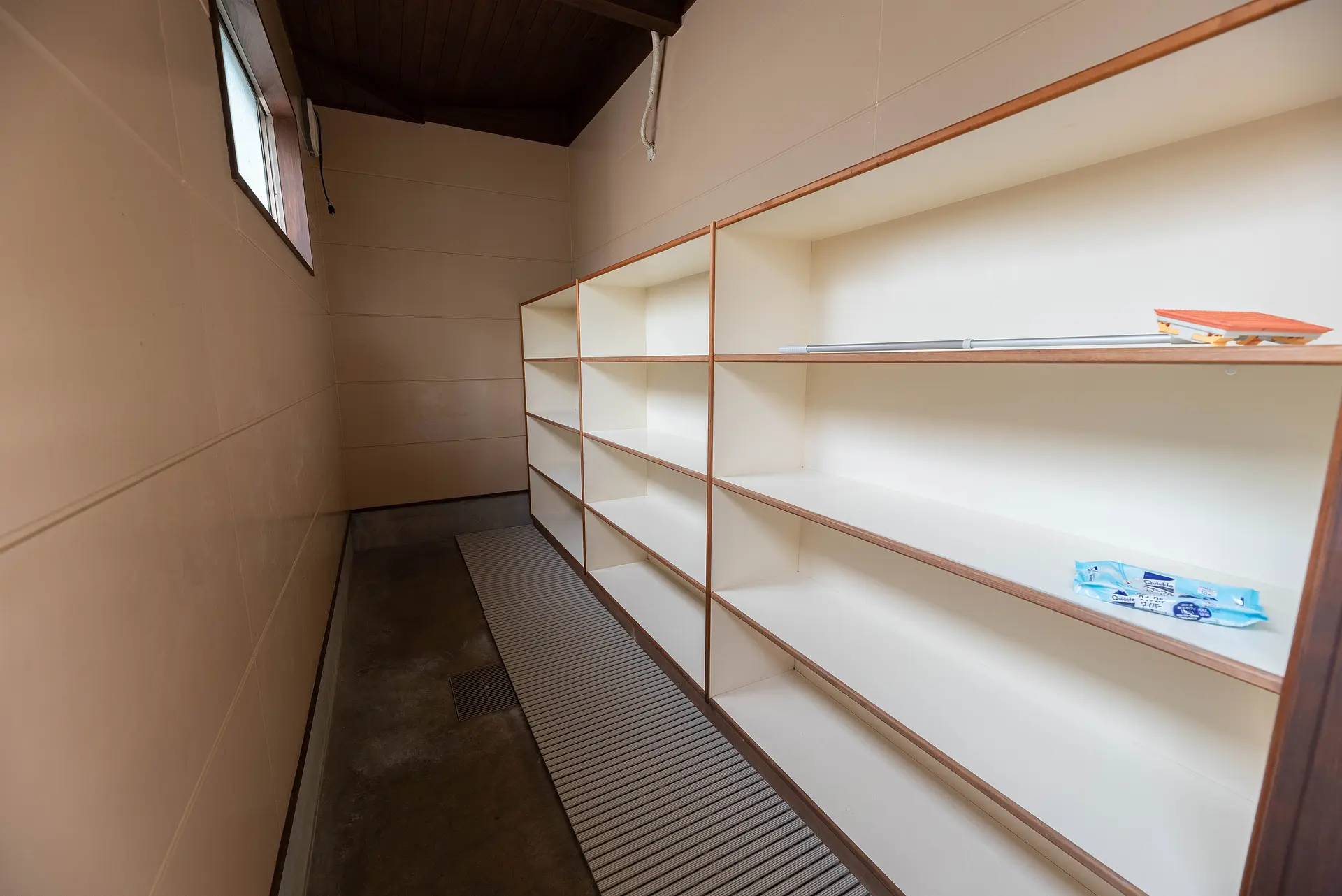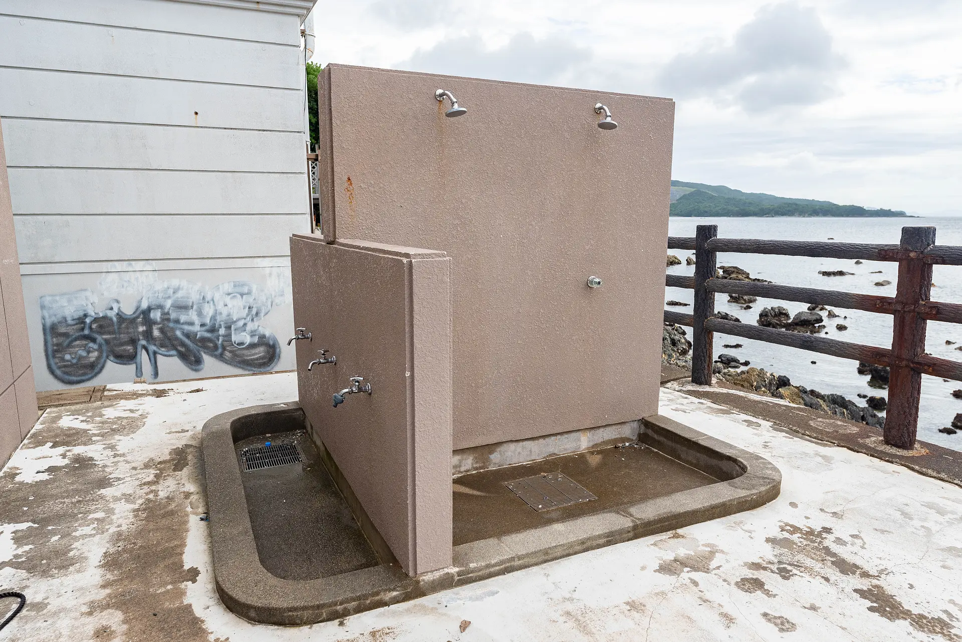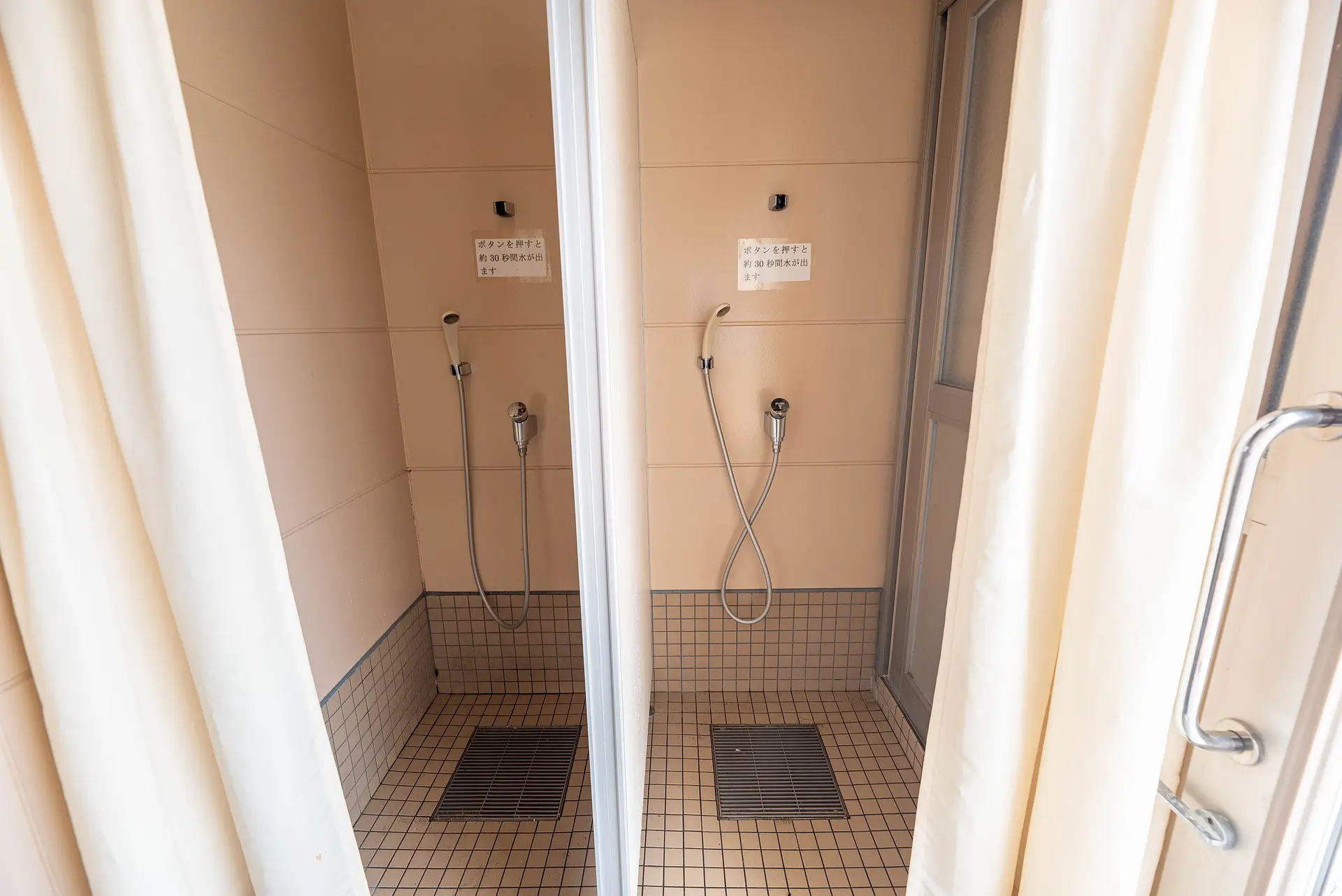 外に水シャワー(4 基)があるので、男性はここで全身を流してから、更衣室で着替えてください。
