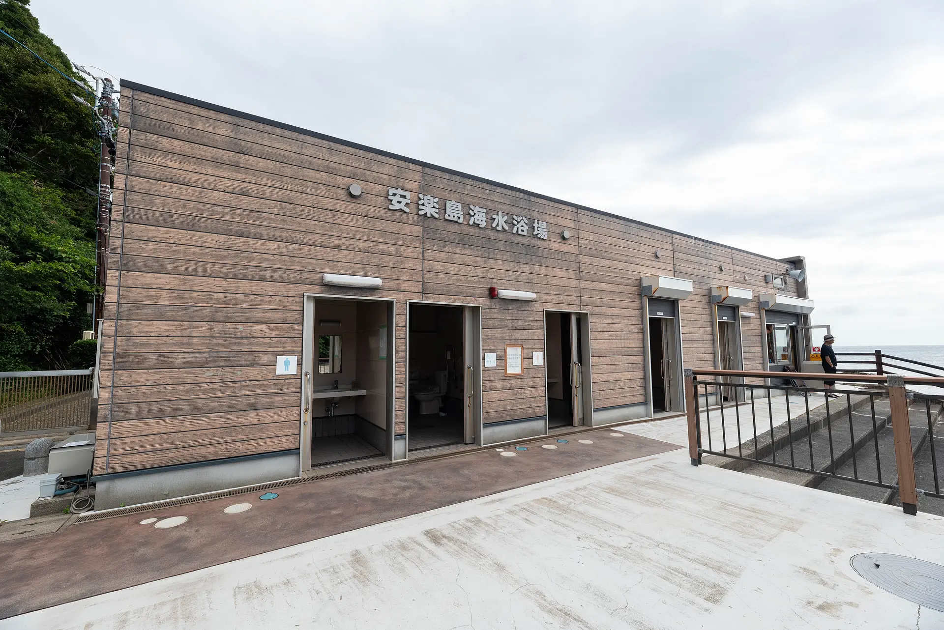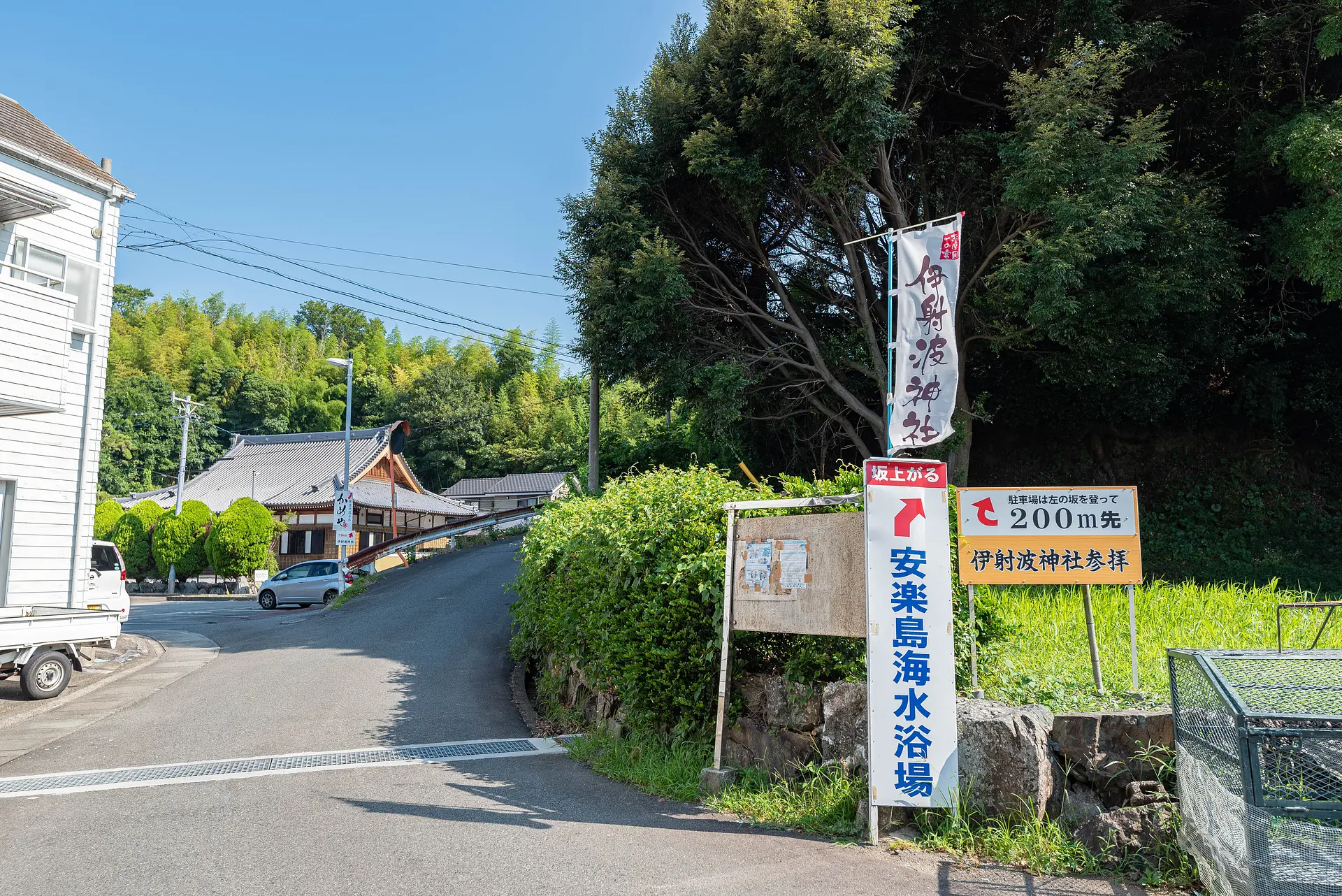 「安楽島舞台」と呼ばれる建物の左側にある坂道を昇っていくと、5 分ほどで海水浴場へと到着します。