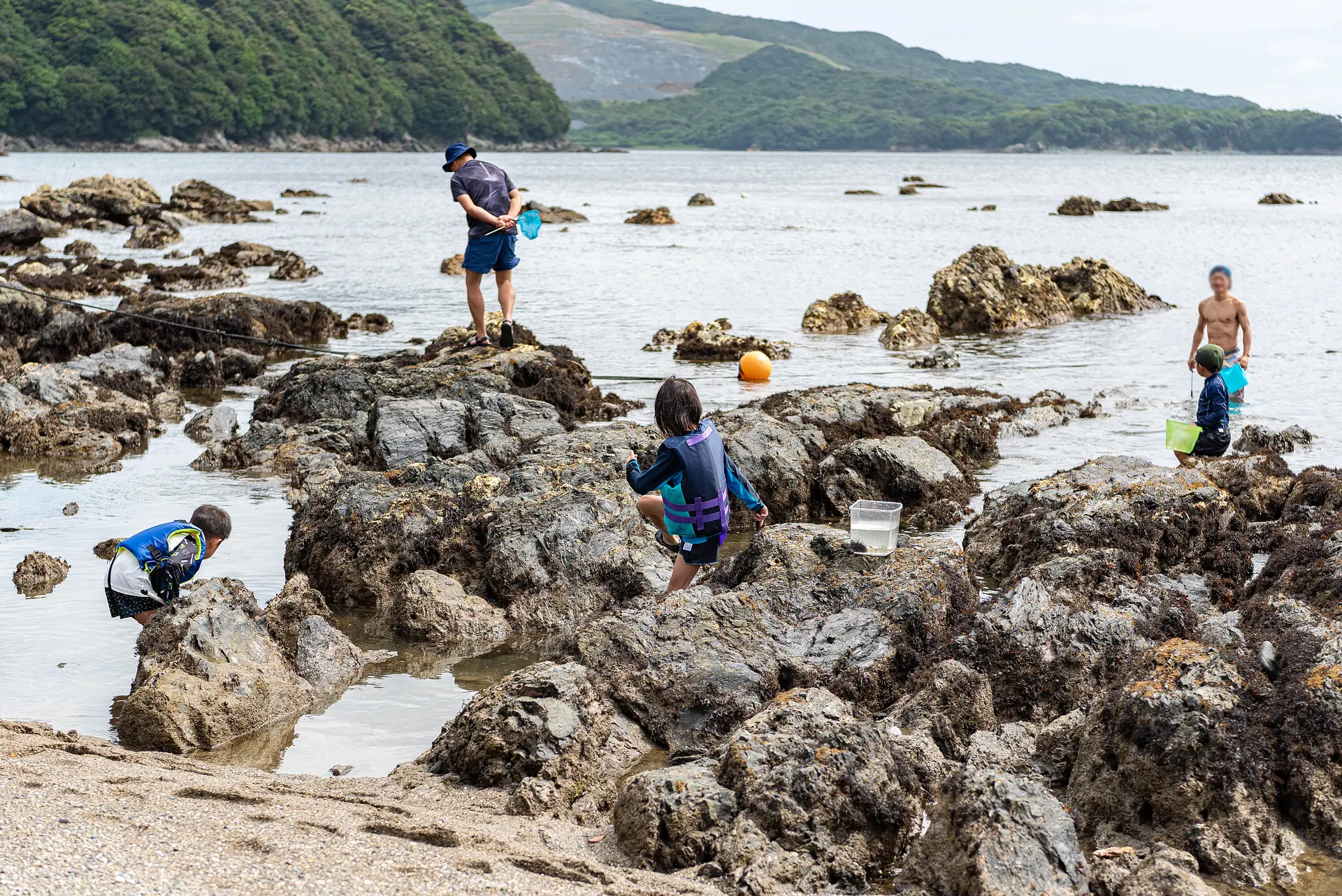 また、更衣室の前では干潮時に岩場が露出するので、網やバケツを片手に生き物観察にはげむ人の姿も。