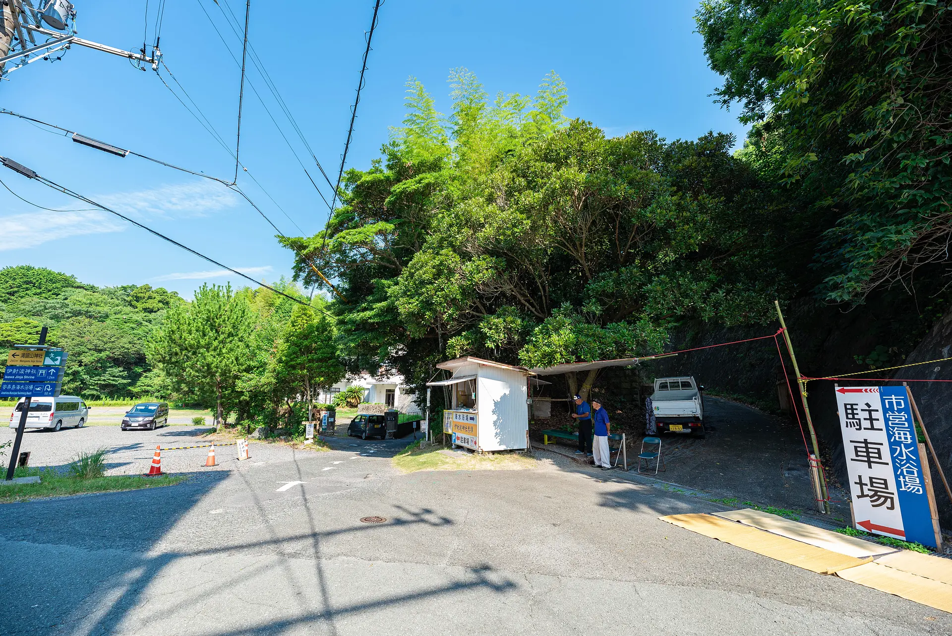 車を利用する場合は、海水浴場のすぐ前に地元老人会が管理する駐車場があるので、そこへ車を停めてください。