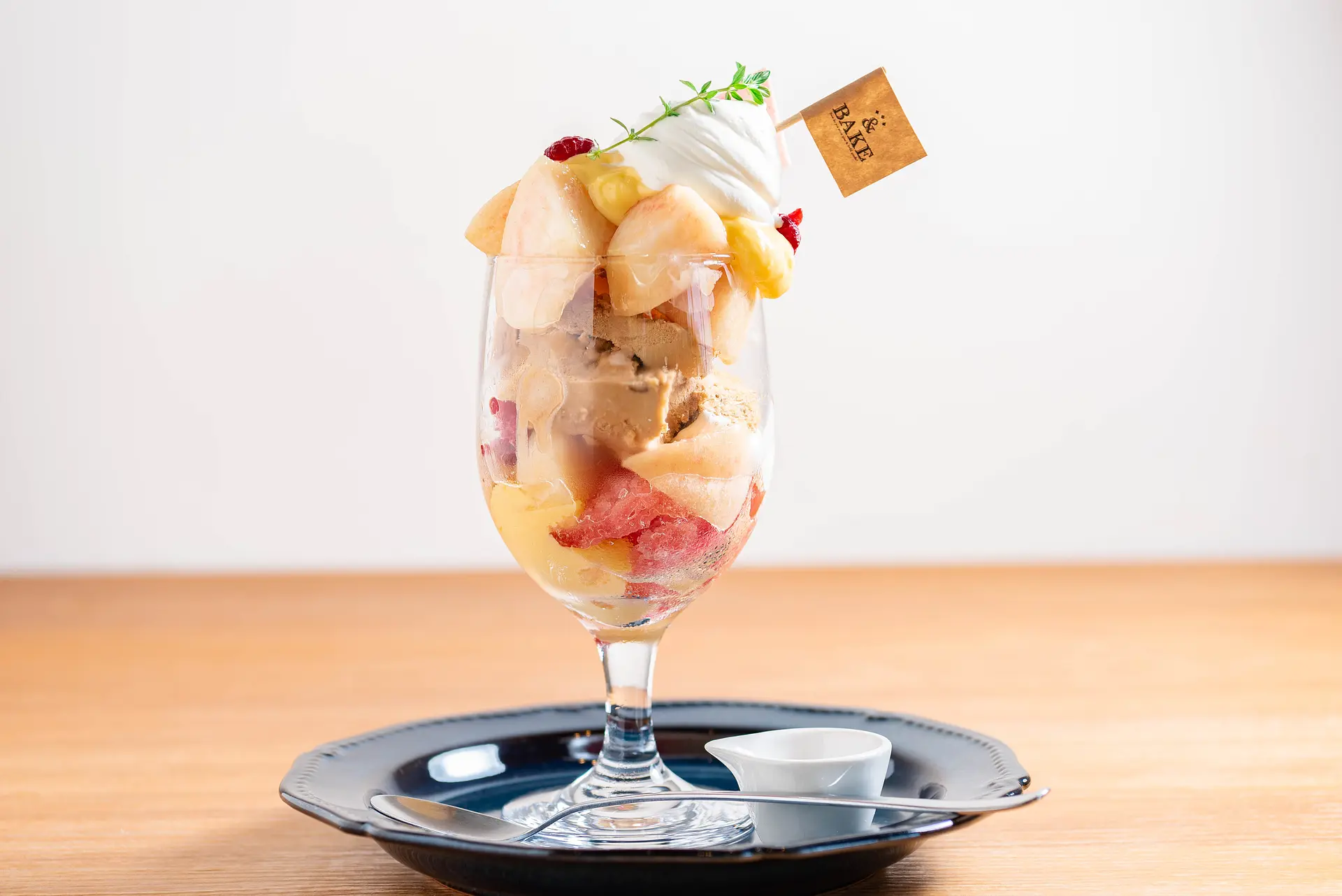 フレッシュな桃と自家製カスタードソース、ロイヤルミルクティアイス、ミルクティーシフォンなどが美しく層をなす「ピーチメルバパフェ(1,320 円)」など、季節の食材を使ったパフェを一年中提供しています。