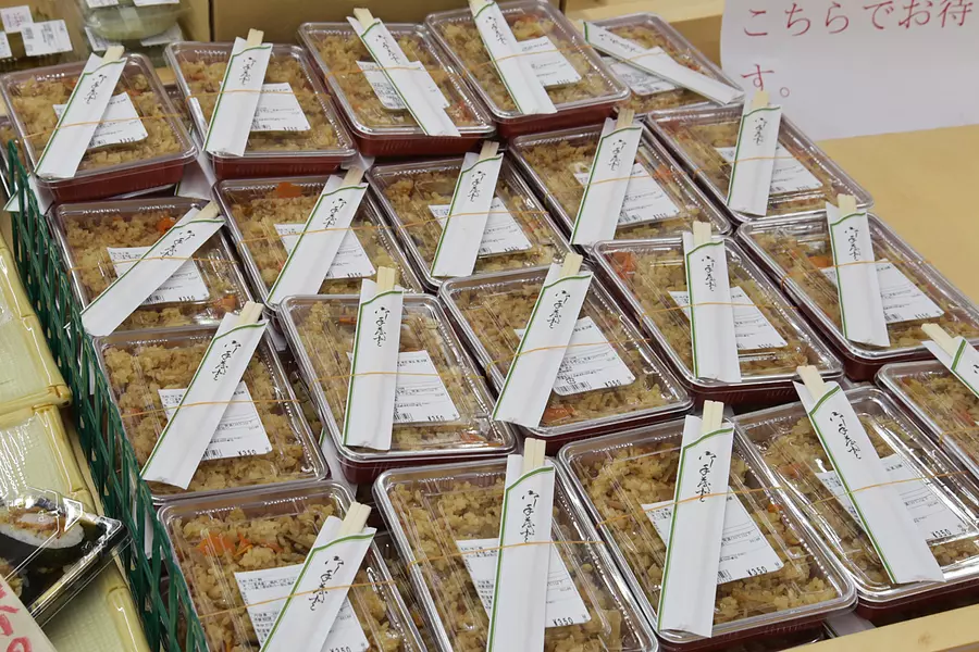 朝津味には加工工房があり、豆腐や和菓子、お総菜などが出来たてで購入できます。写真のとりめしは、朝津味がある高野尾町の地元グルメなんだそう。