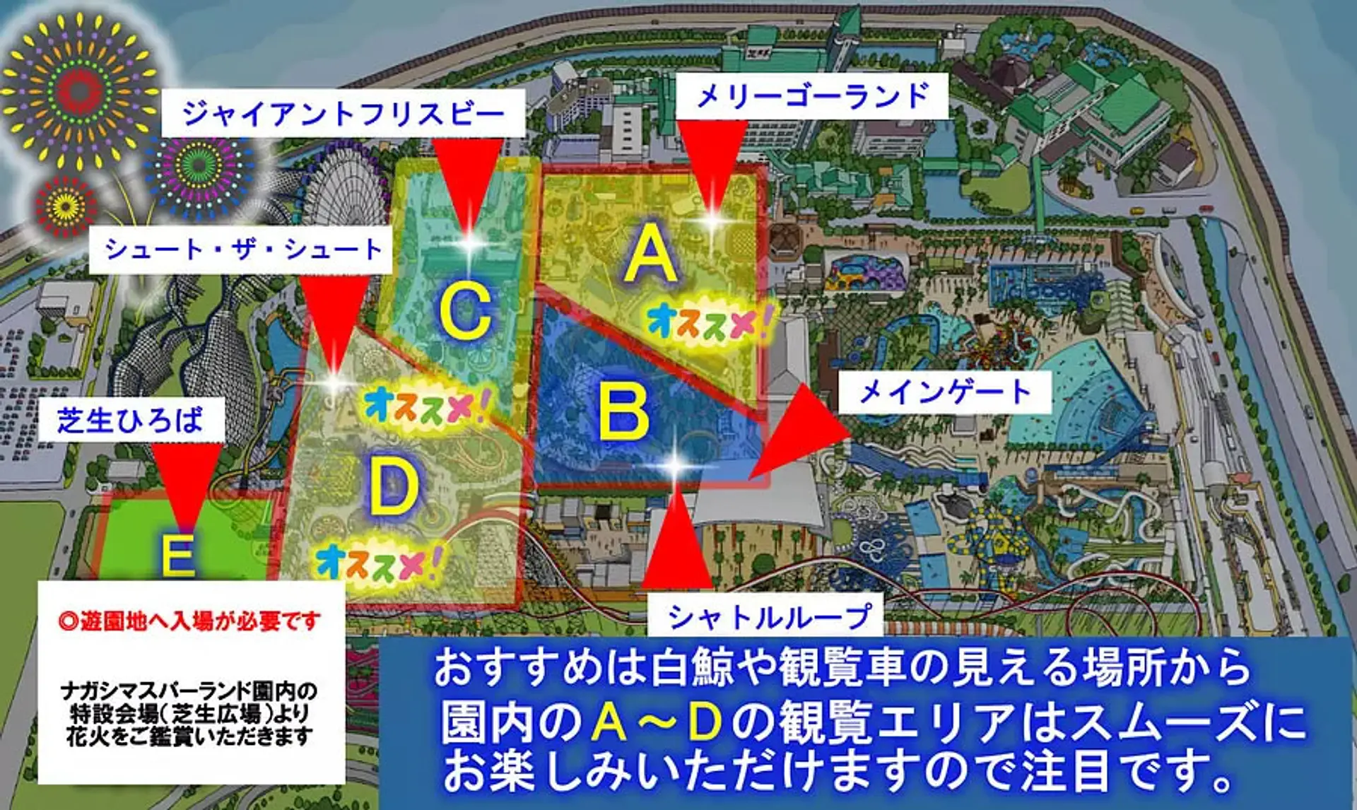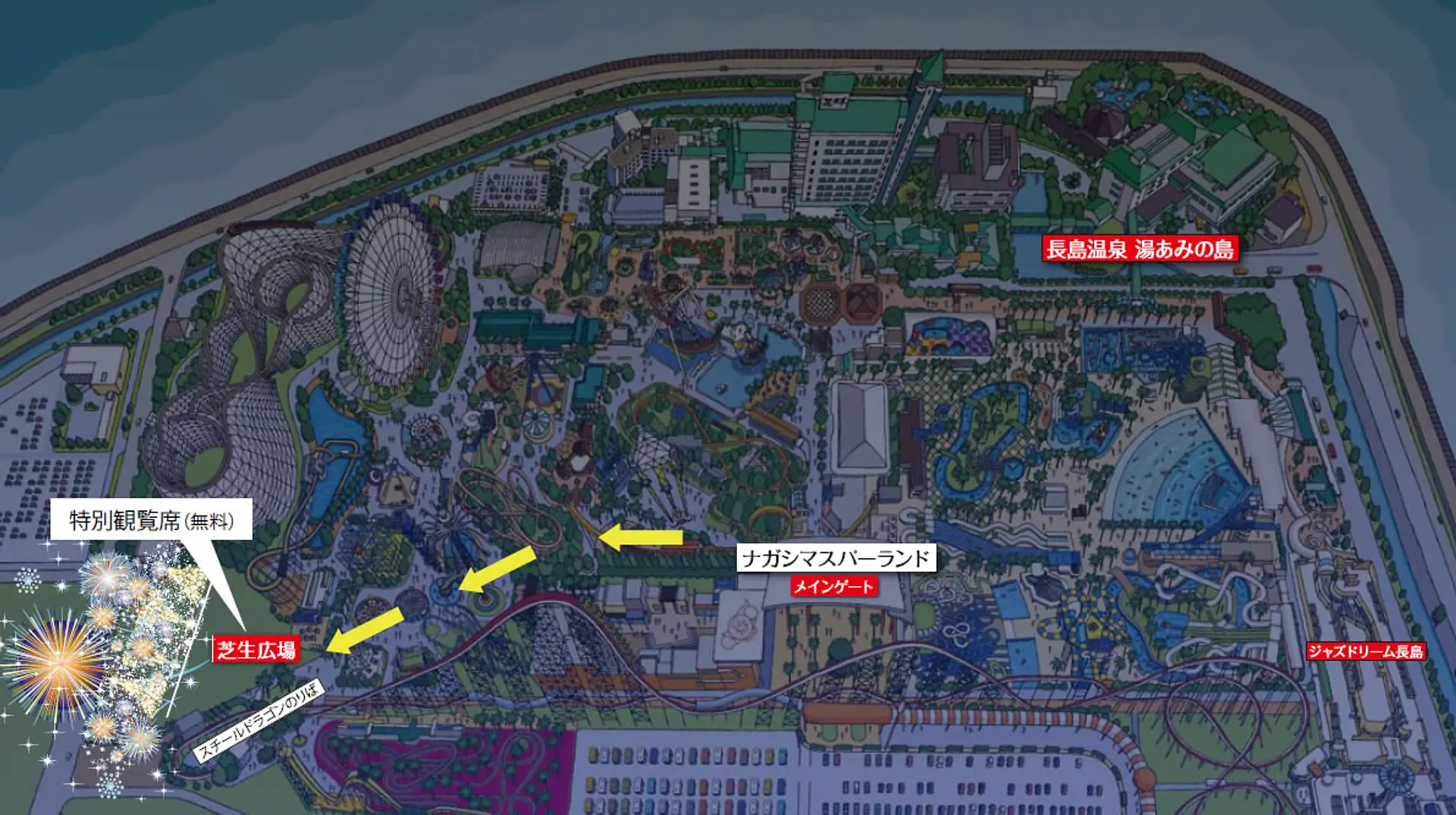 ナガシマスパーランドへの入場料が必要となりますが、花火観覧席の入場料は「無料」です!