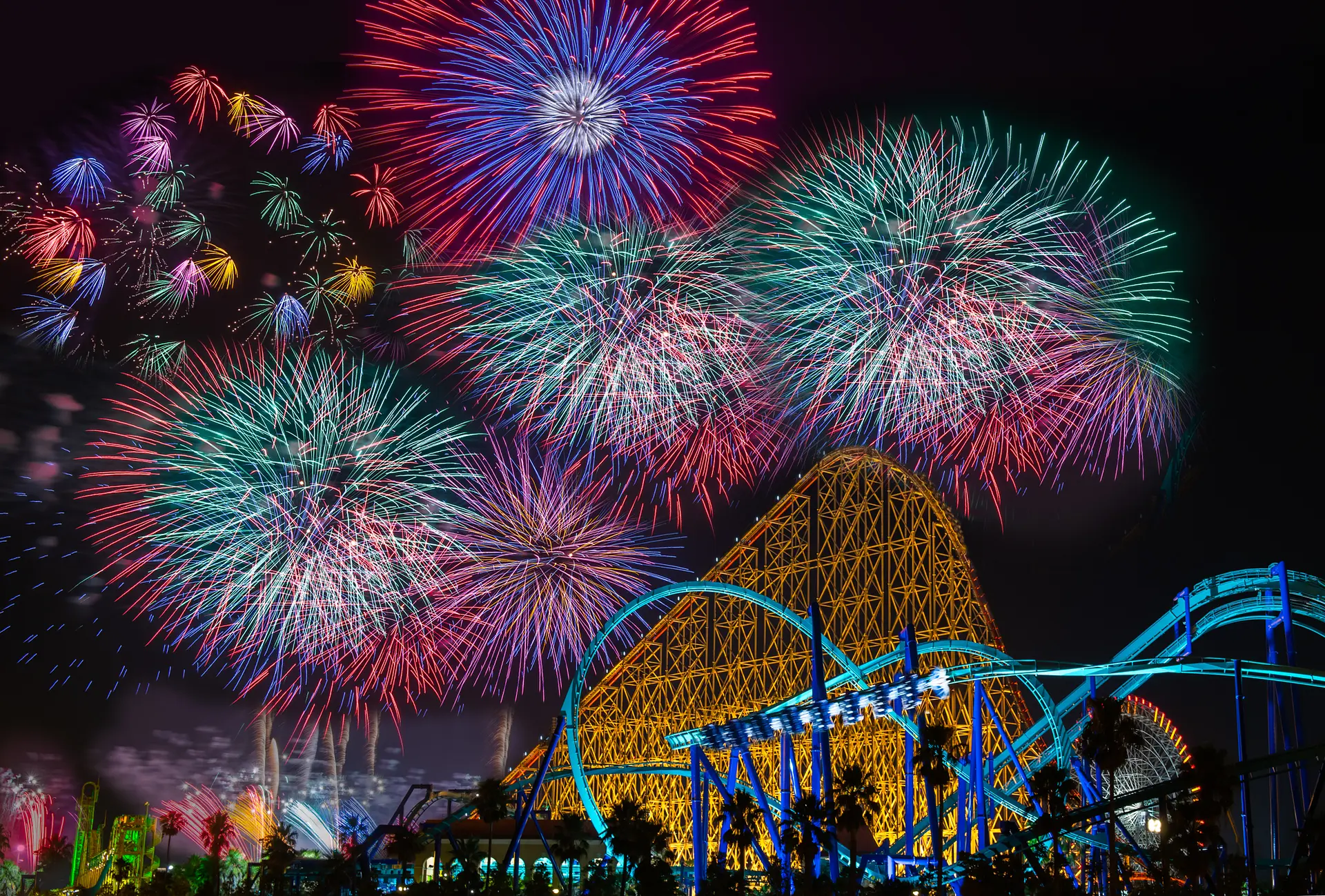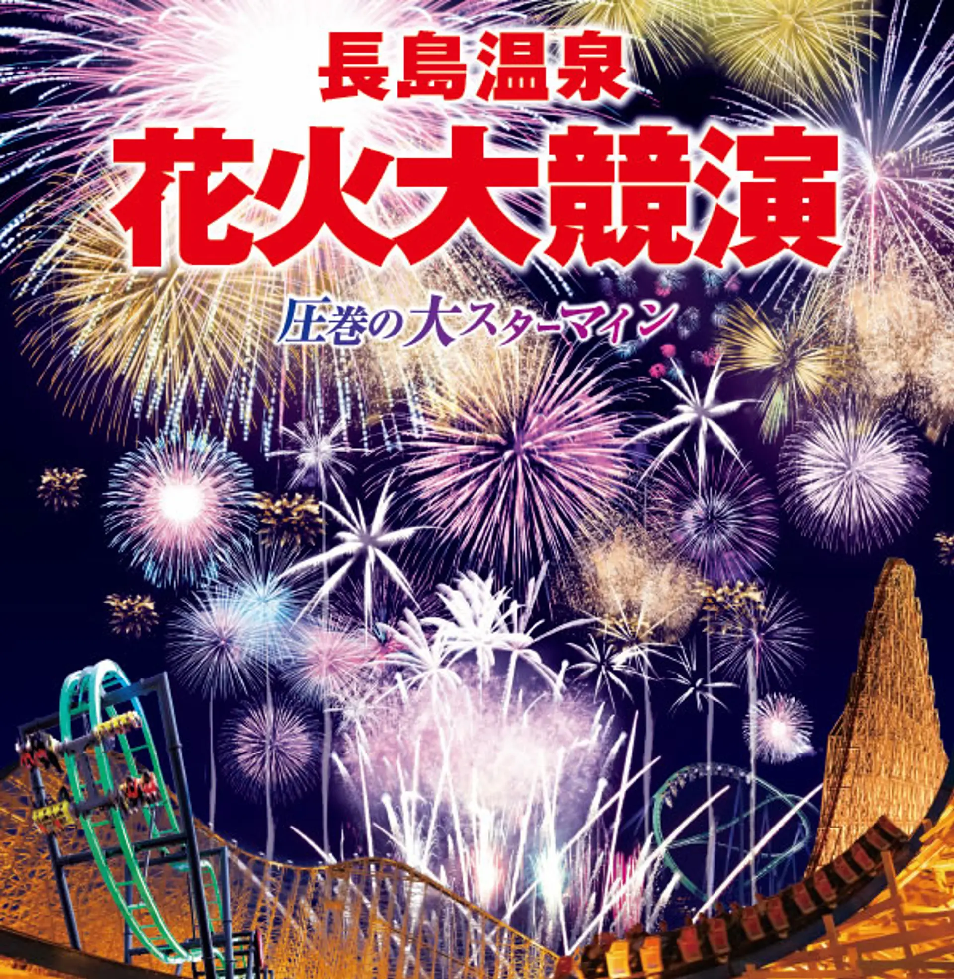 打上花火や迫力のあるスターマインがみどころ。遊園地のアトラクションと一緒に楽しみたい。園内からならどこからでも楽しめます!ここでは長島温泉の花火の見どころを「二つの”競演”」と称してご紹介します。