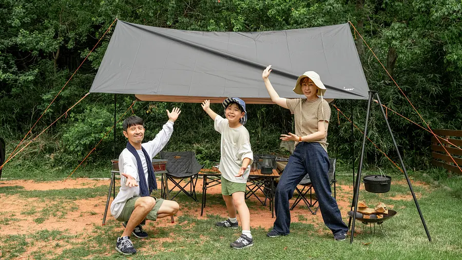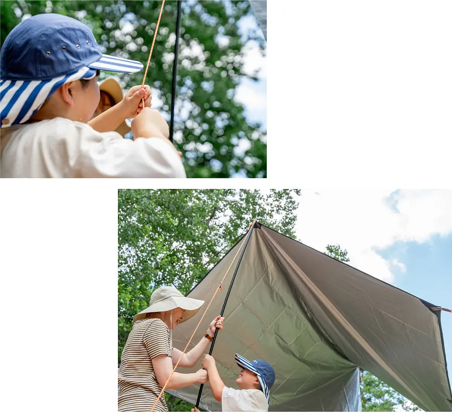 レンタルしたタープを親子で協力しながら組み立てていきます。